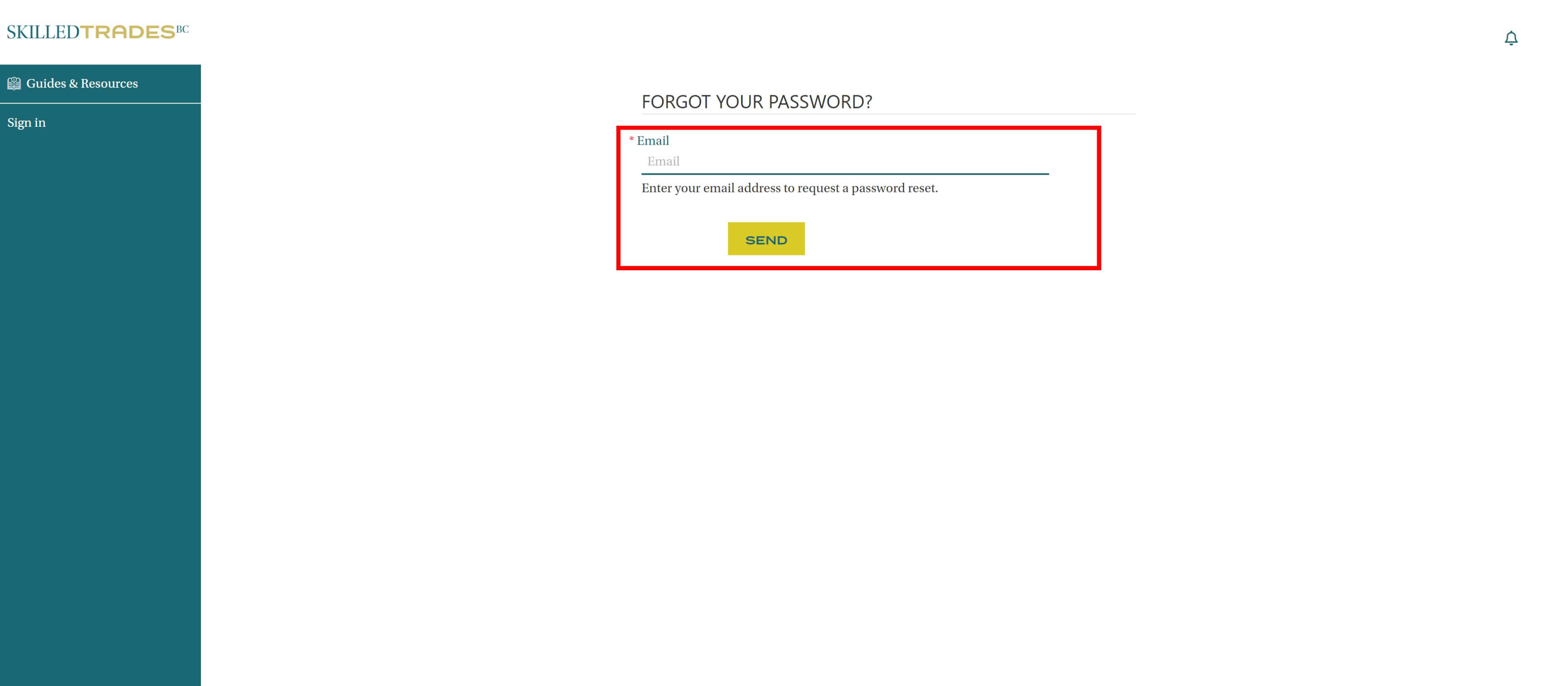 Users will be prompted to provide the email address they provided when they registered as an apprentice or sponsor. Enter the email address and click send.