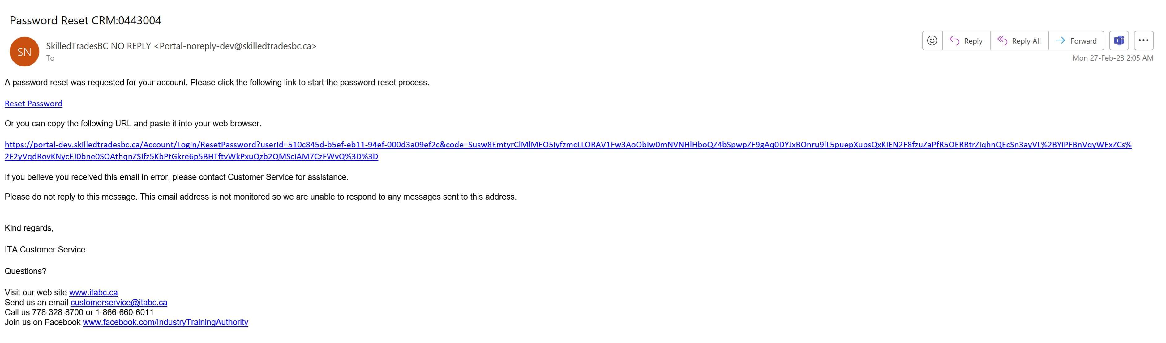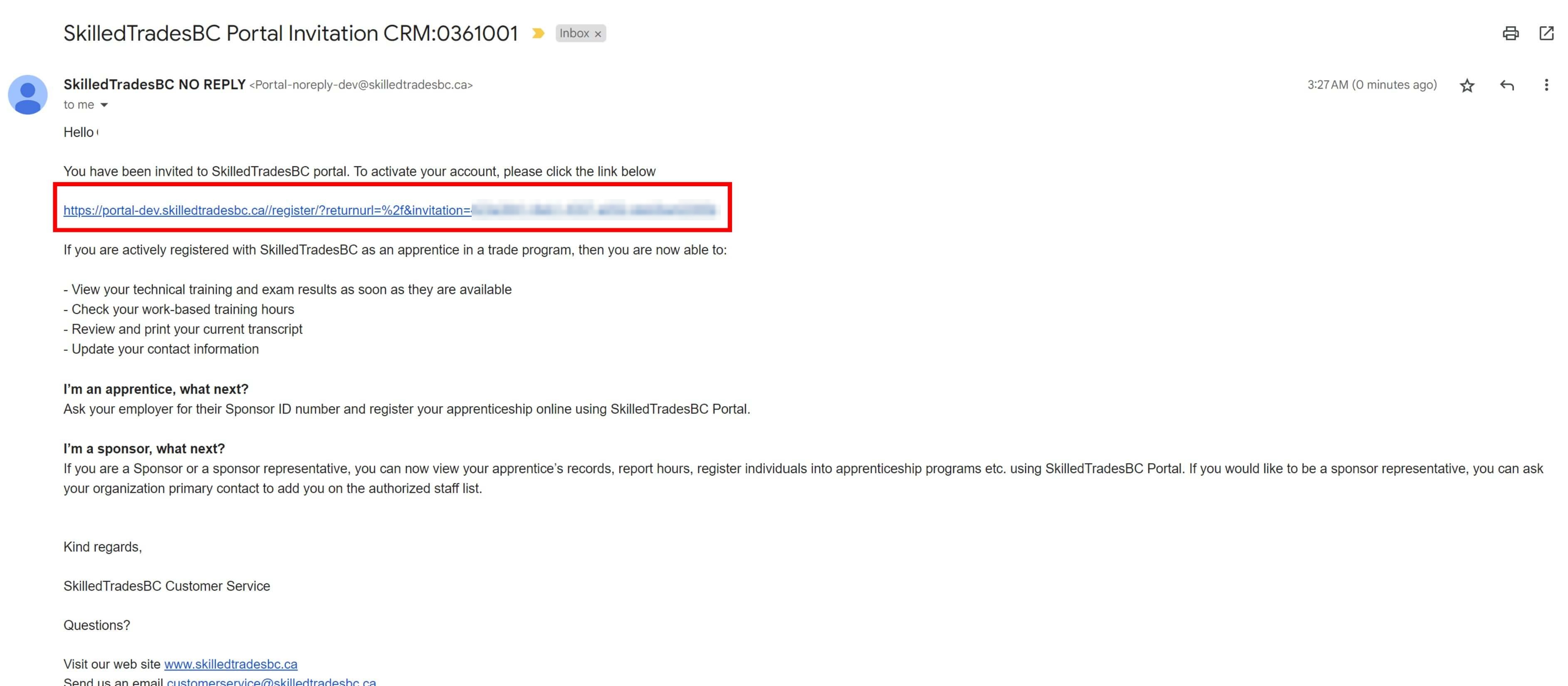 An invitation link is sent to the email they registered with directing them to sign-up for the SkilledTradesBC portal.