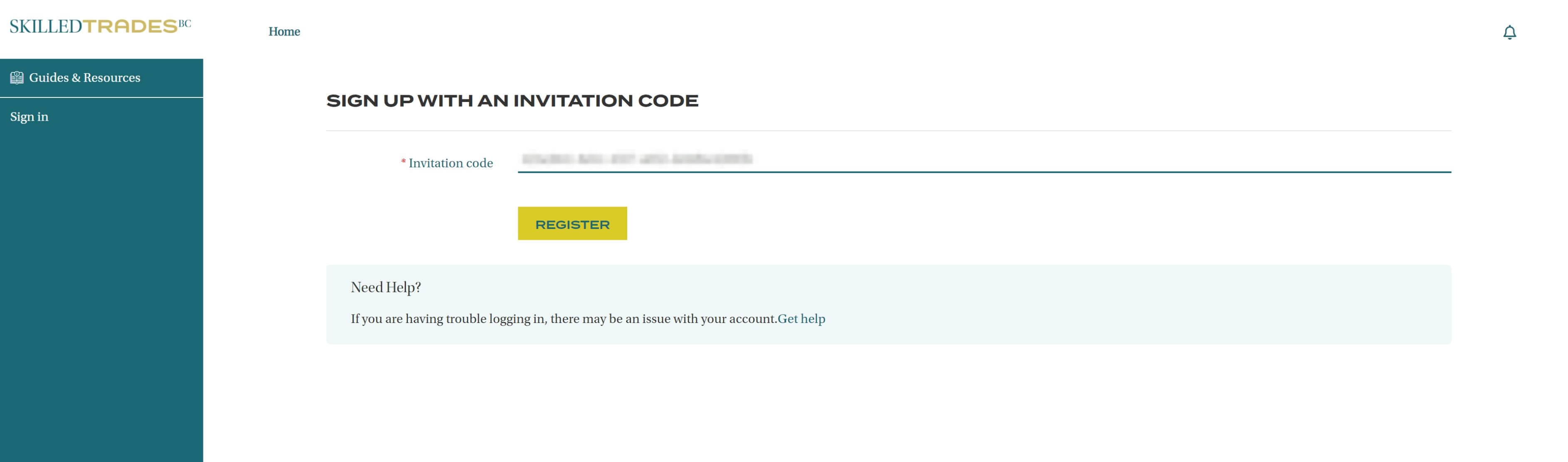 The existing registered SkilledTradesBC users will receive an invitation link directing them to sign-up for the SkilledTradesBC portal.