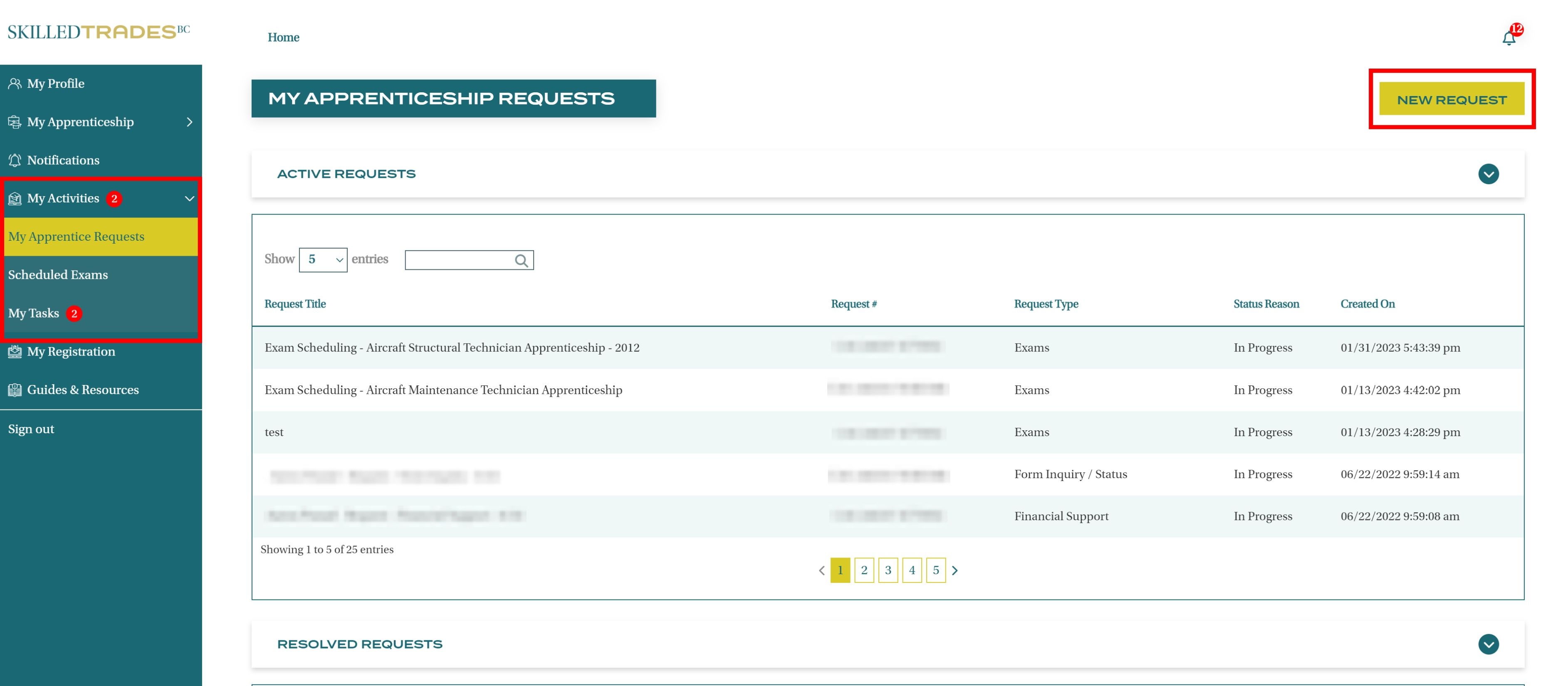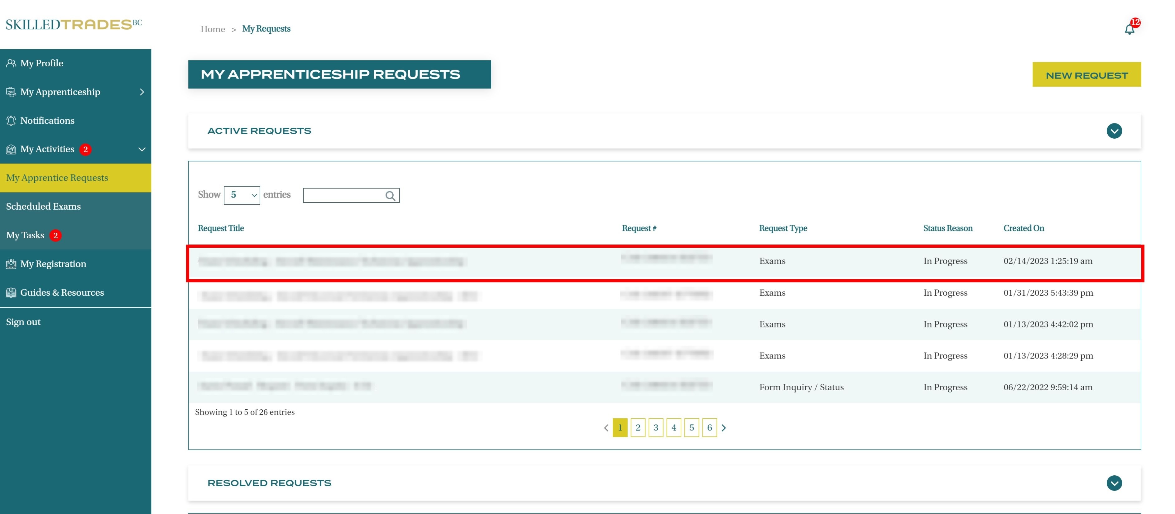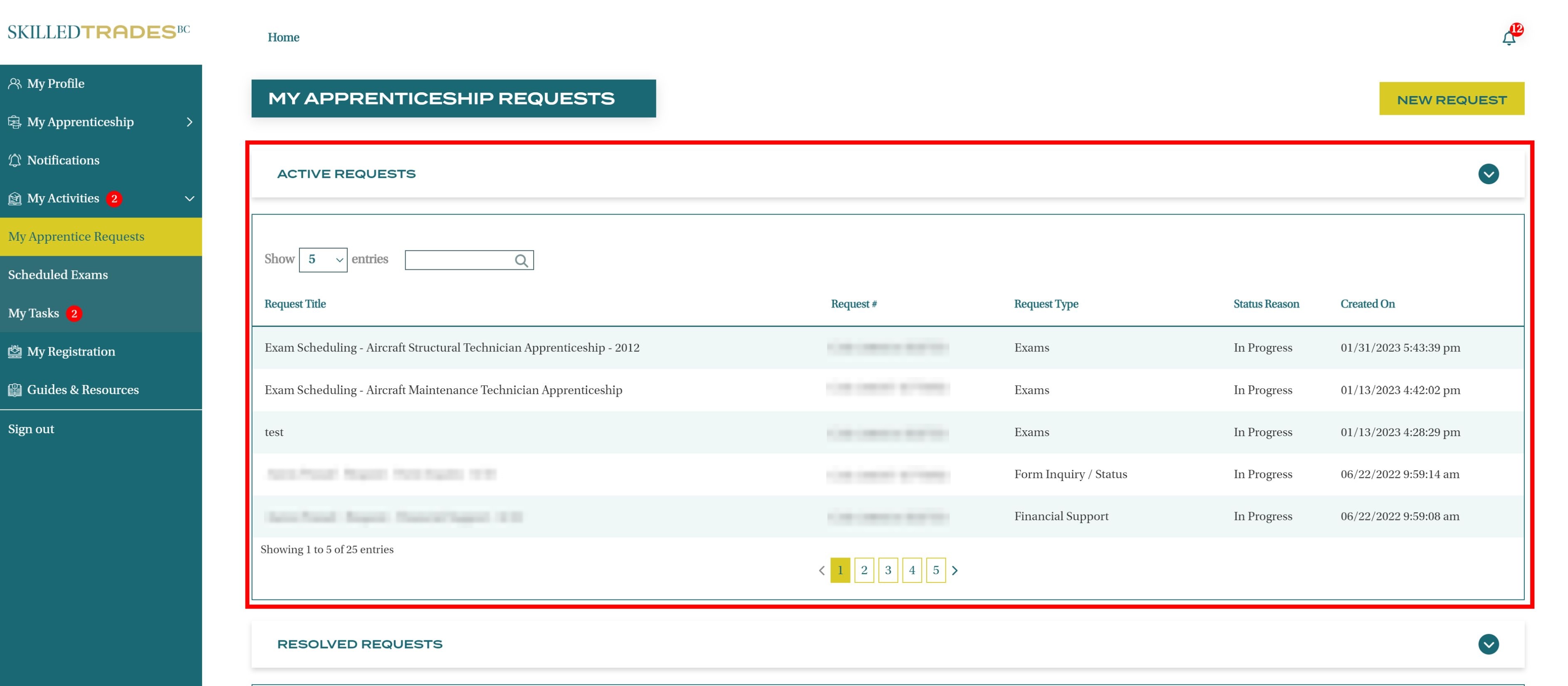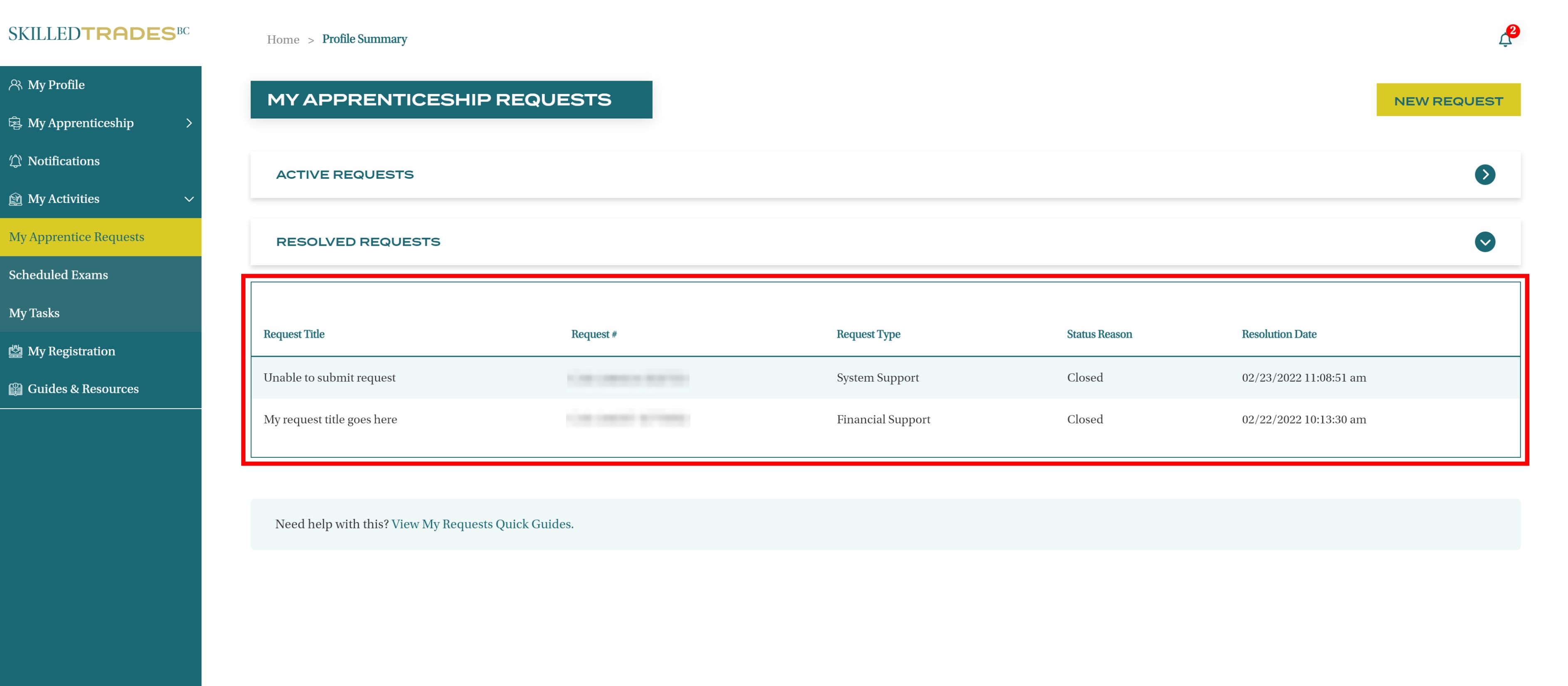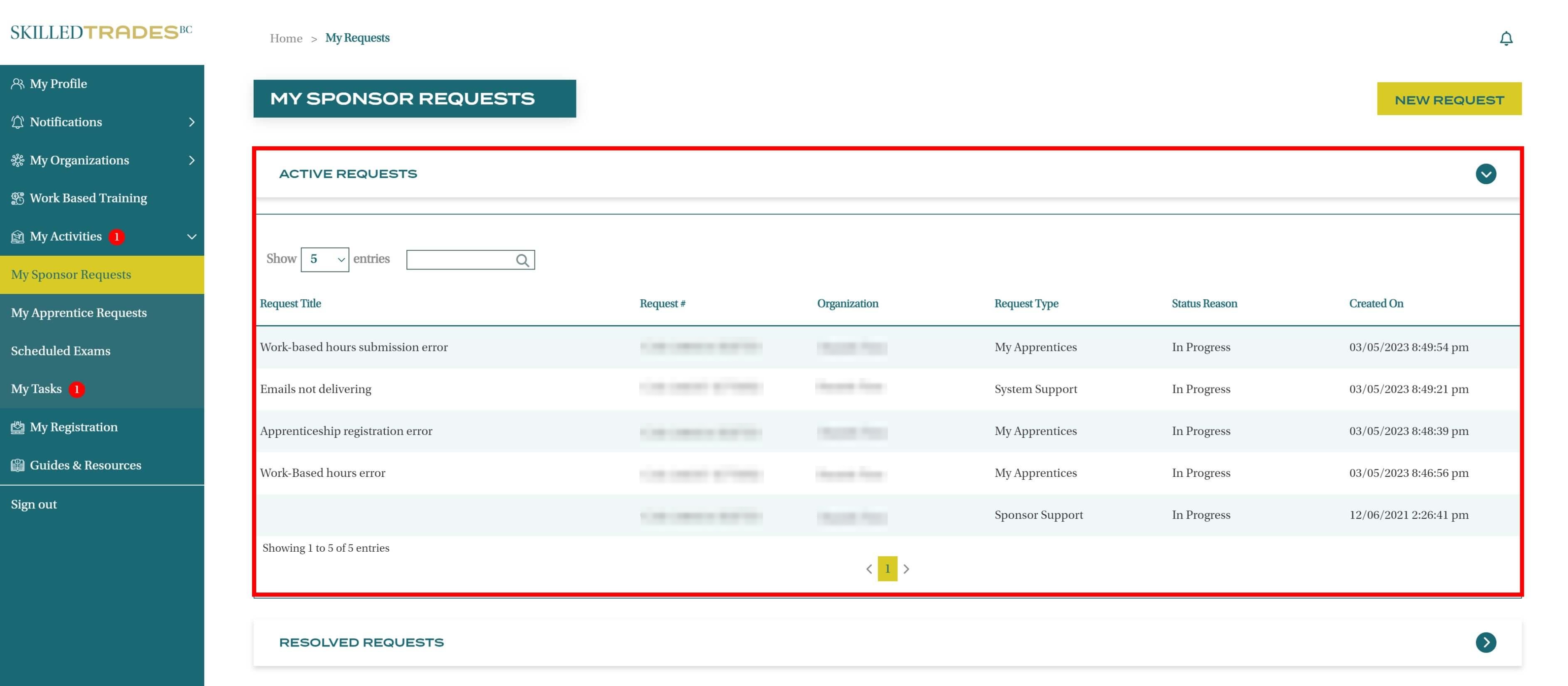 After you create a new request, SkilledTradesBC will work on the request. Afterward, you may be required to follow up on the request. View resolutions under Resolved Requests.