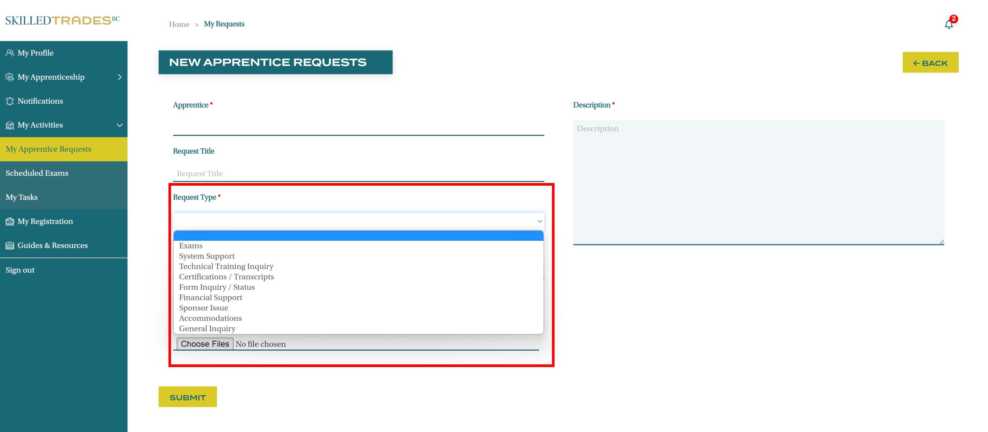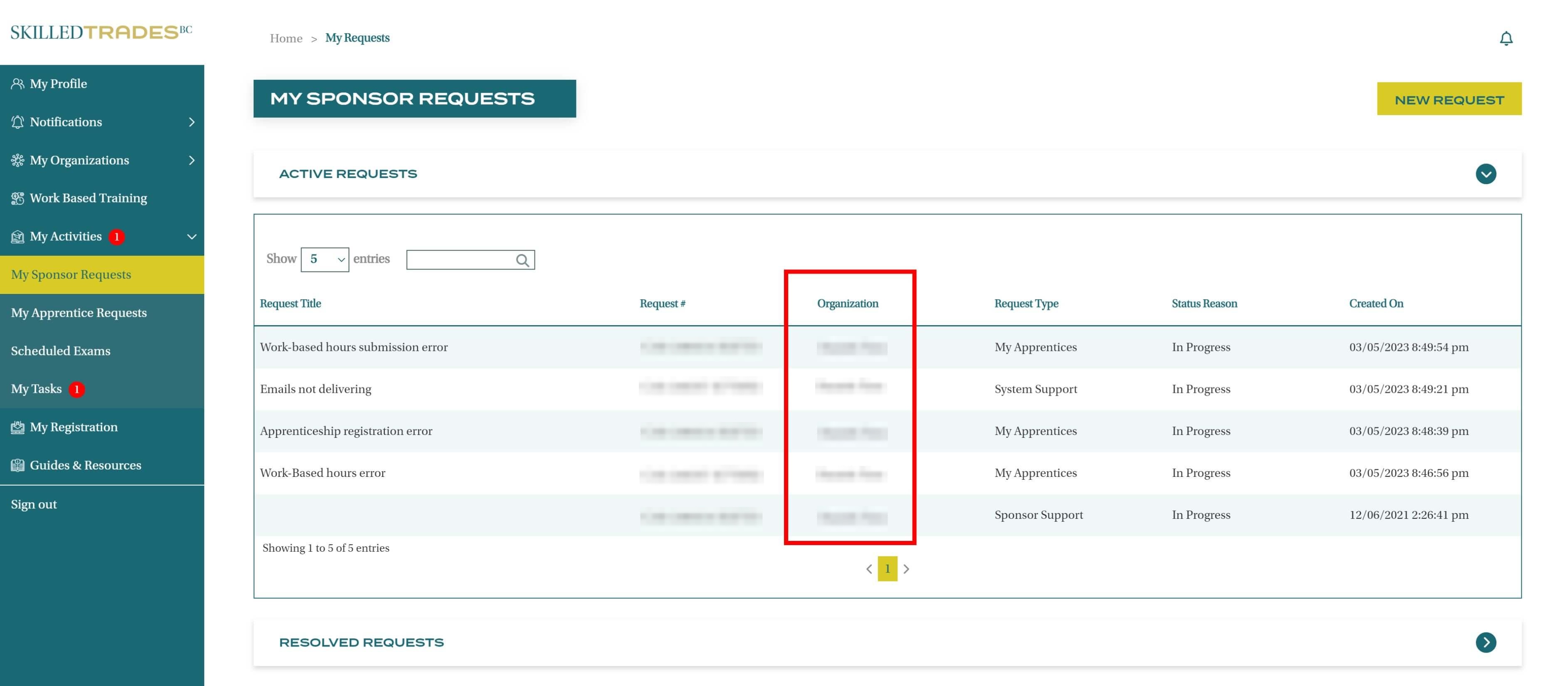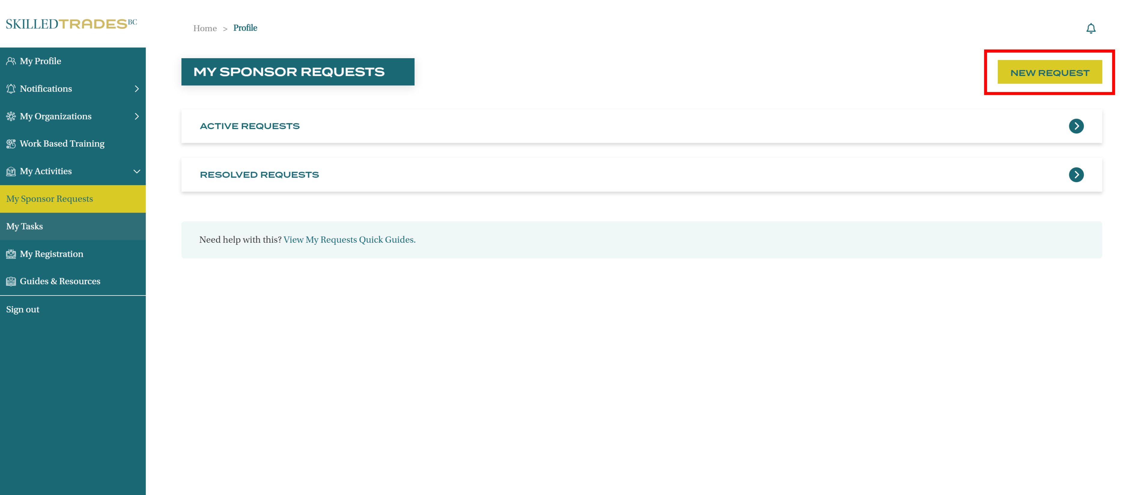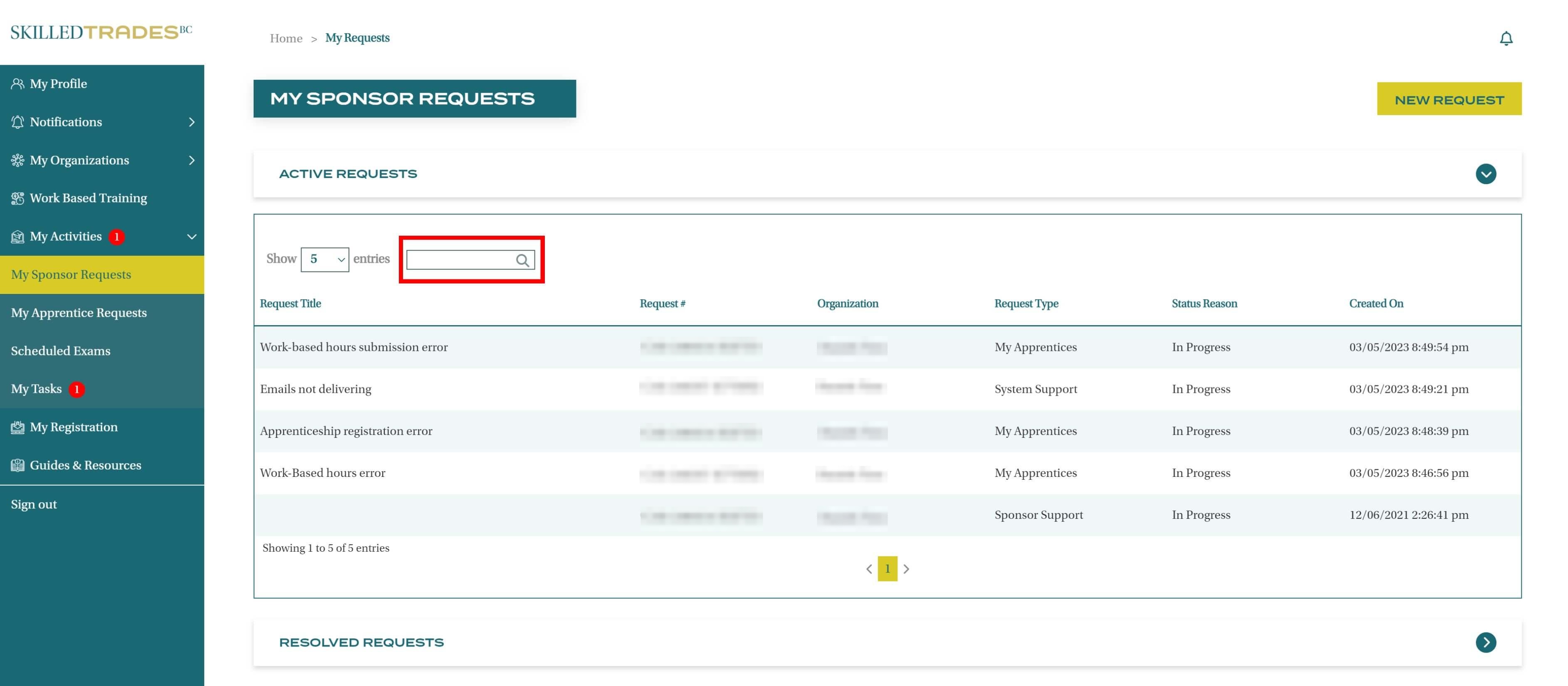 After you create a new request, SkilledTradesBC will work on the request. Afterward, you may be required to follow up on the request. View resolutions under Resolved Requests.