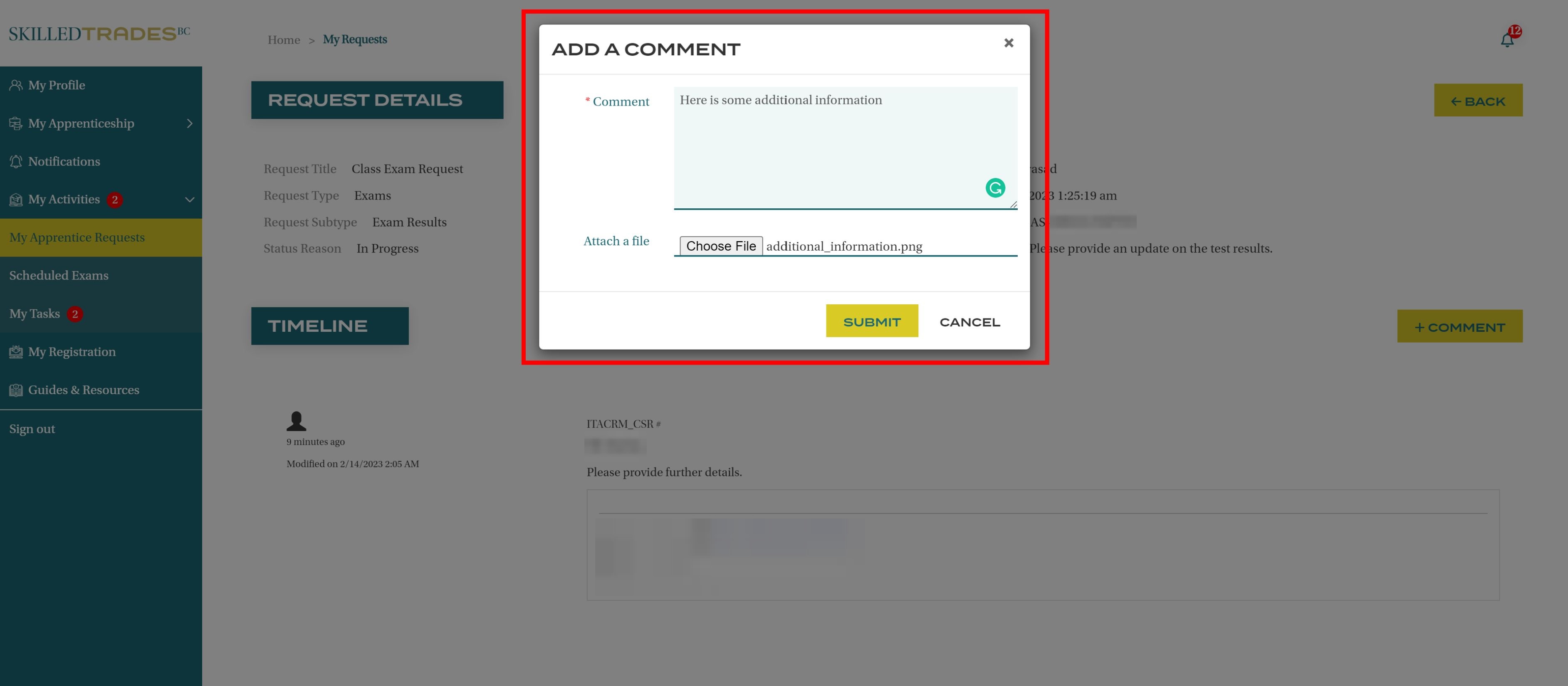 Double click on the request to open it The Timeline provides updates regarding the user’s request, including any notes by the SkilledTradesBC.