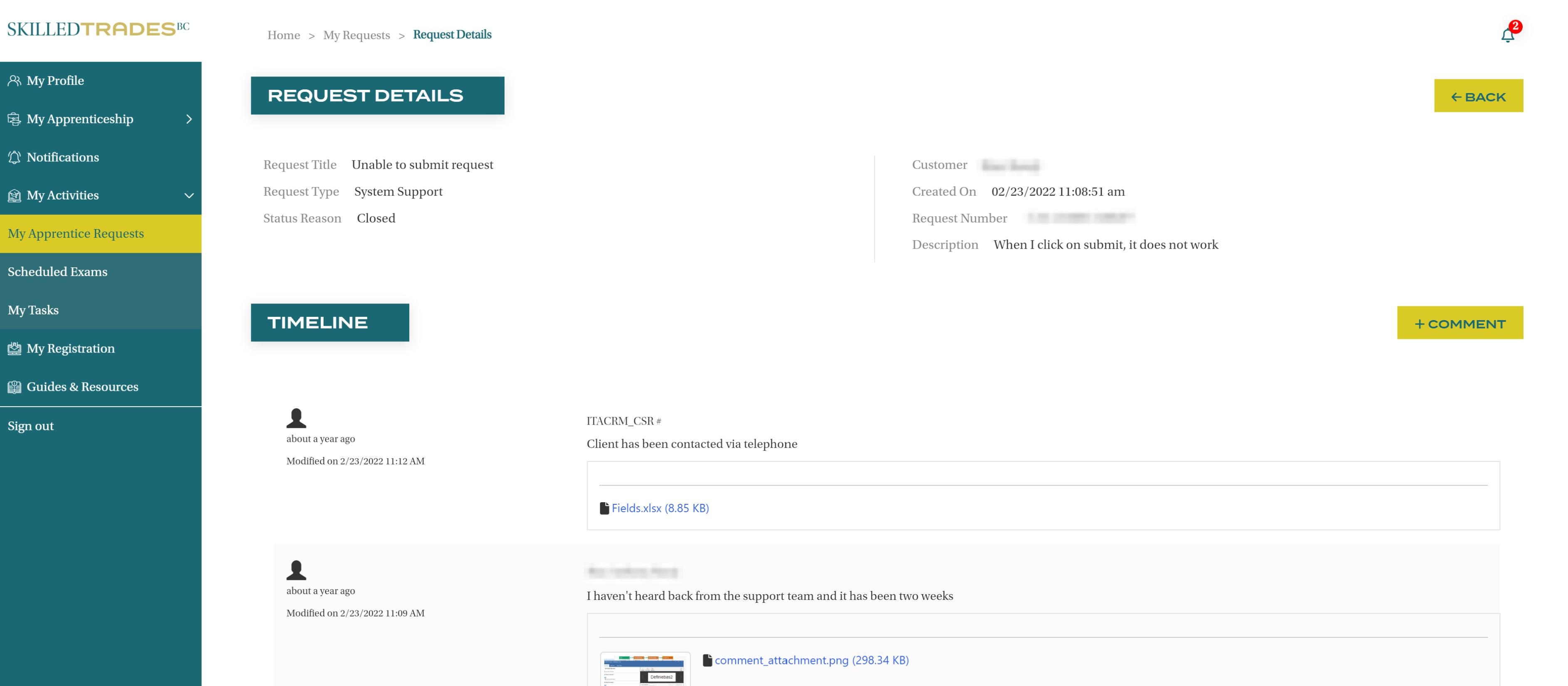 After a request is created in the portal, the SkilledTradesBC will work on the request. Either a resolution will be posted or they may ask for follow-up information/documents.