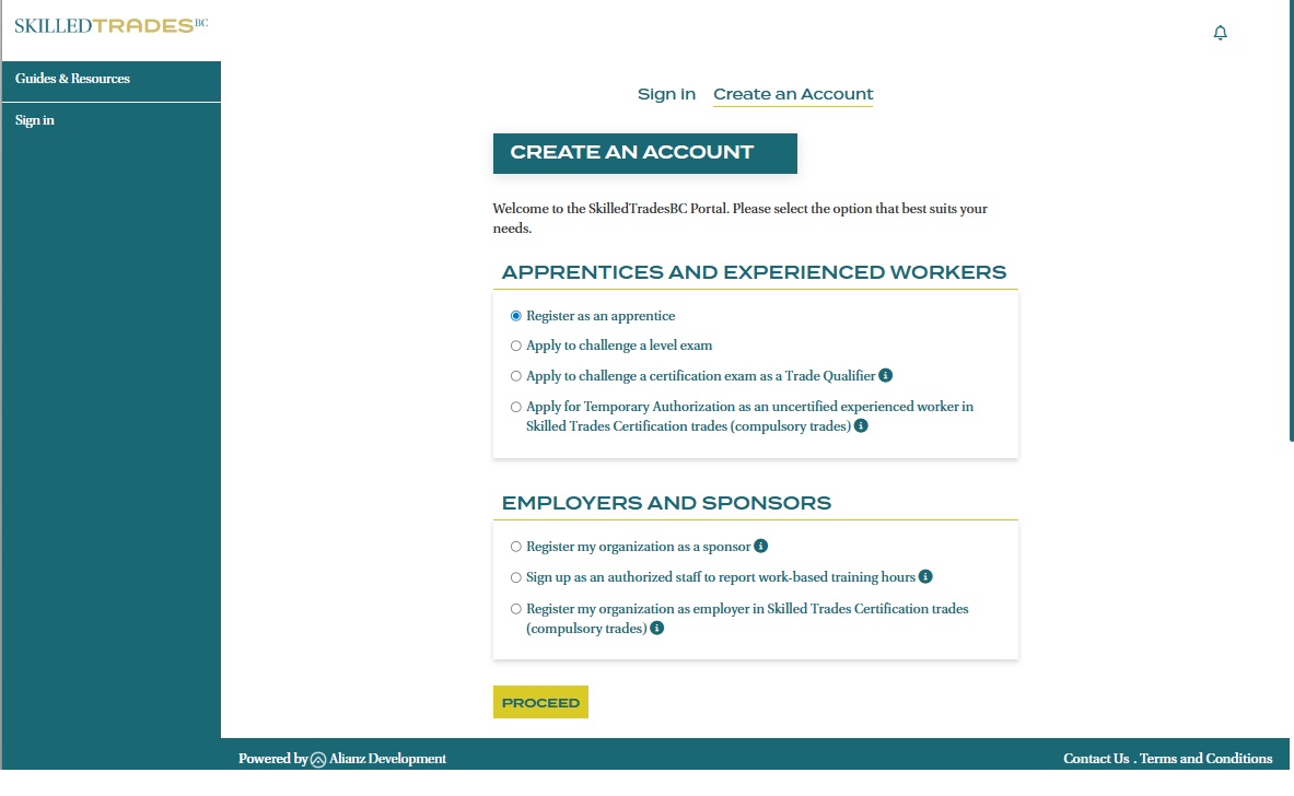 - Select the option “Register as an apprentice” and click “Proceed” button to continue.