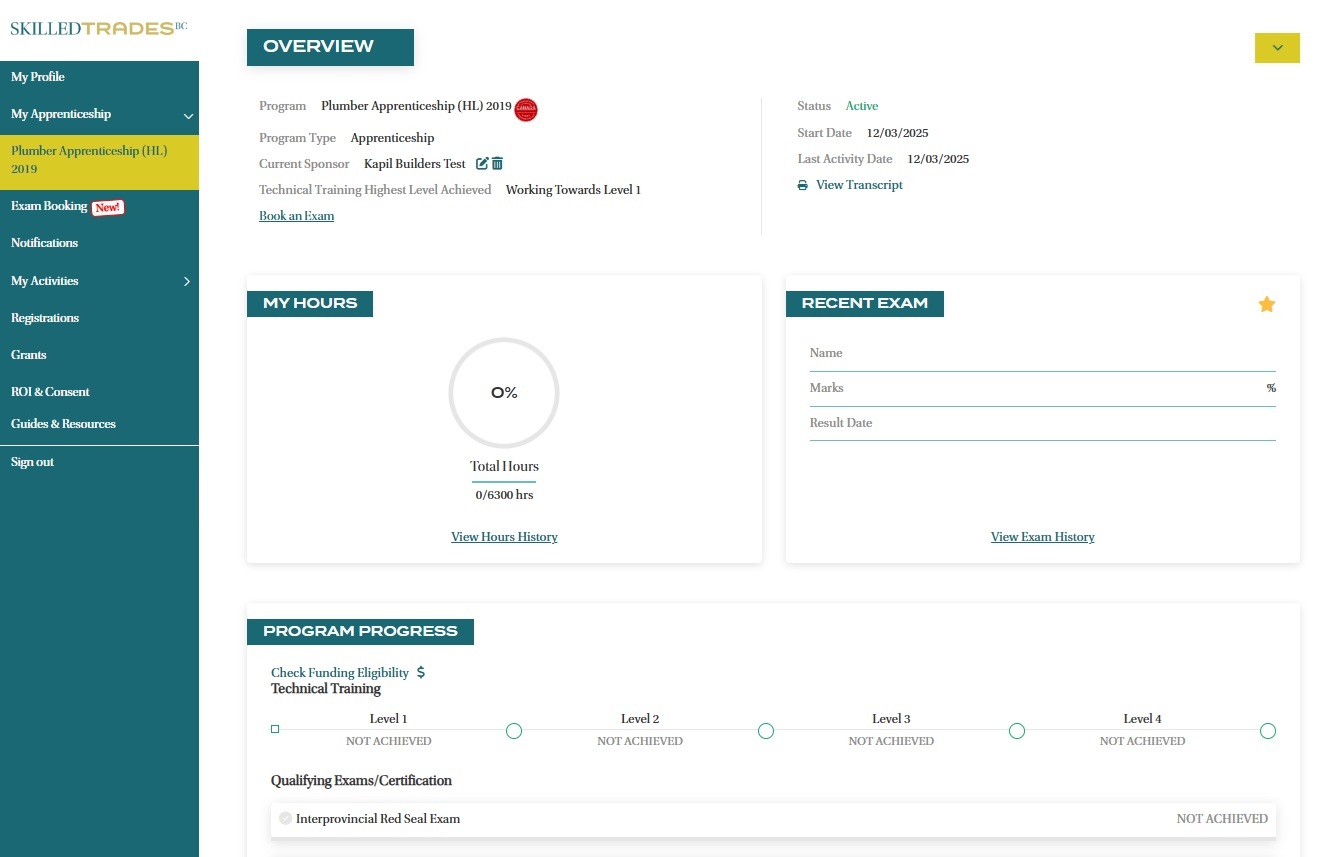 The My Apprenticeship section contains all your active apprenticeships. Clicking on your trade program name will bring up your apprenticeship progress including the following and more: