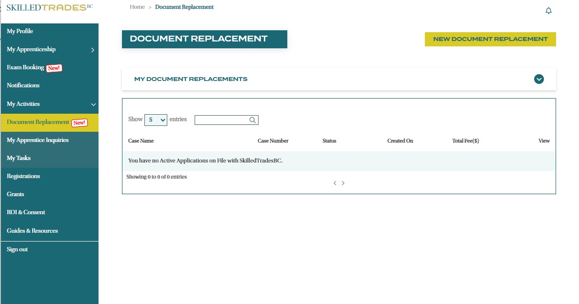 - Create a request for Document Replacement (eg. Certificate of Qualification Wallet Card, Certificate of Apprenticeship Wall Certificate, Welder Logbook).