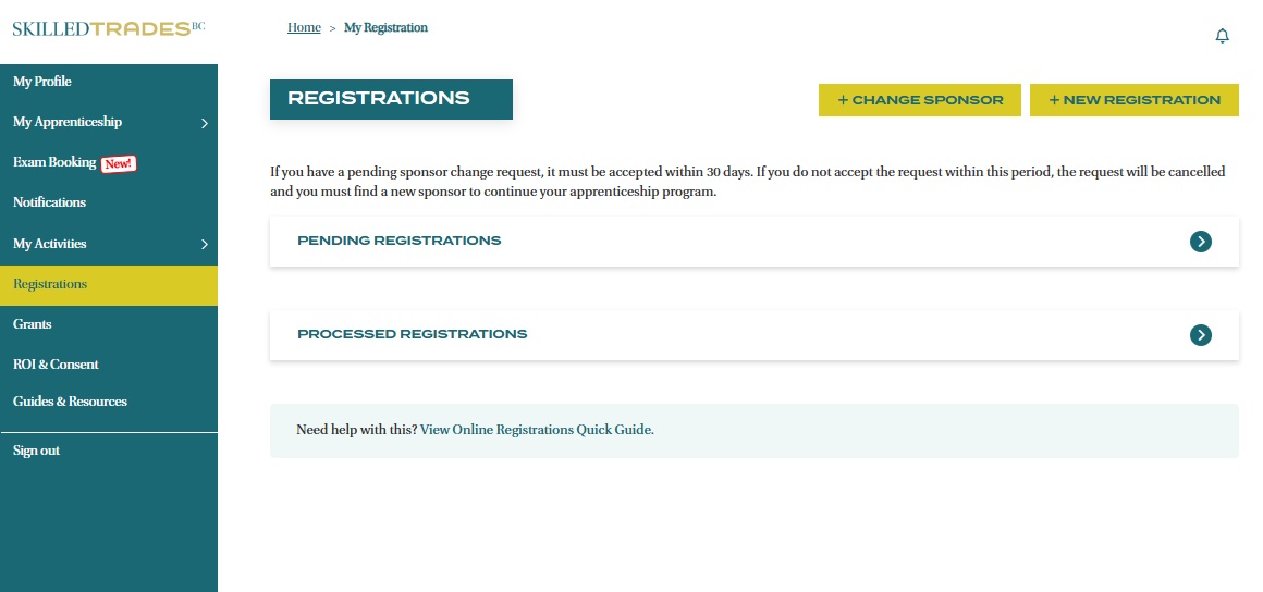 In this section, you can register for a new apprenticeship program, view your pending registrations, or start the process to change your sponsor.
