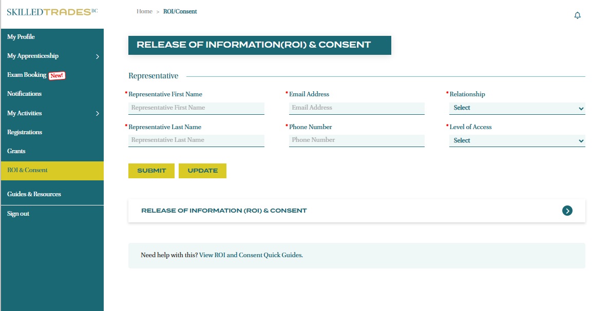 ROI (Release of Information) & Consent allows you to give authorized representatives permission to update your apprenticeship information, and for SkilledTradesBC to release information to them.