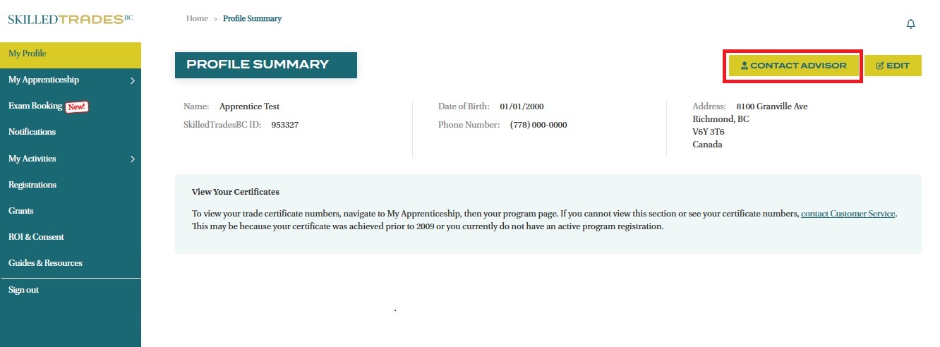 - On your Profile Summary page, click on the “Contact Advisor” button in the top right corner.