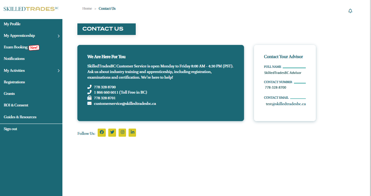 - In the footer, click “Contact Us” to find contact information for Customer Service on the left and the contact information for your regional Apprenticeship Advisor listed in the “Contact Your Advisor” box on the right.