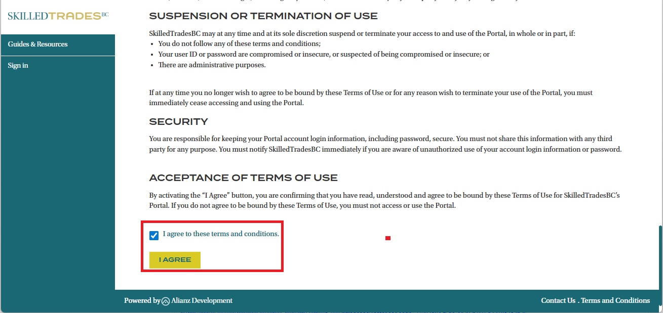 - Read through the terms and conditions for your application. Then, check “I agree to these terms and conditions” box and click on the “I agree” button to continue.