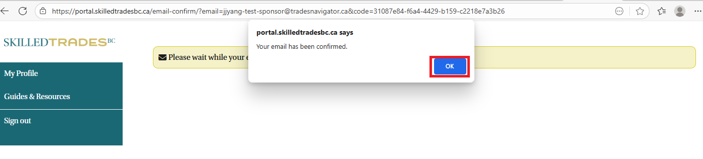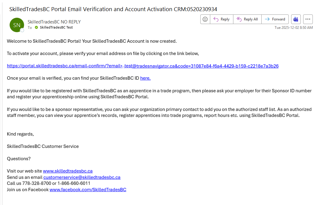 - Once your profile is created, you will receive a confirmation email from SkilledTradesBC containing an activation link.