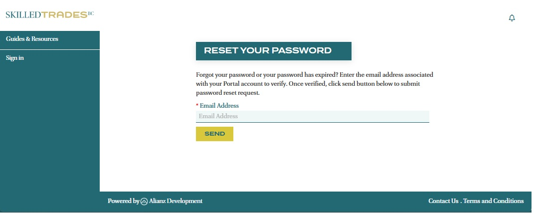 - Enter the email address you used to sign up for a SkilledTradesBC Portal account and click “Send”.