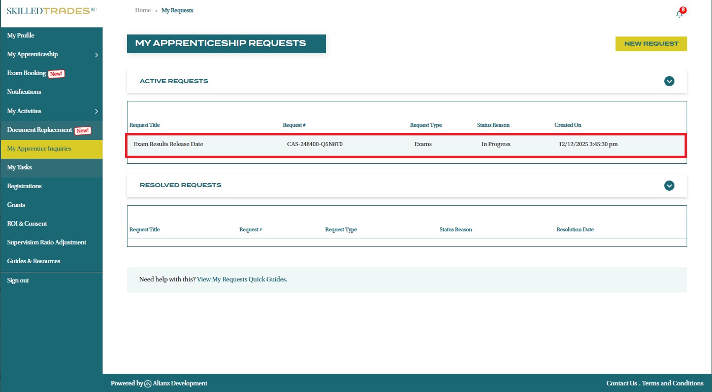 - Once your request has been completed, it will appear under the Resolved Requests section.