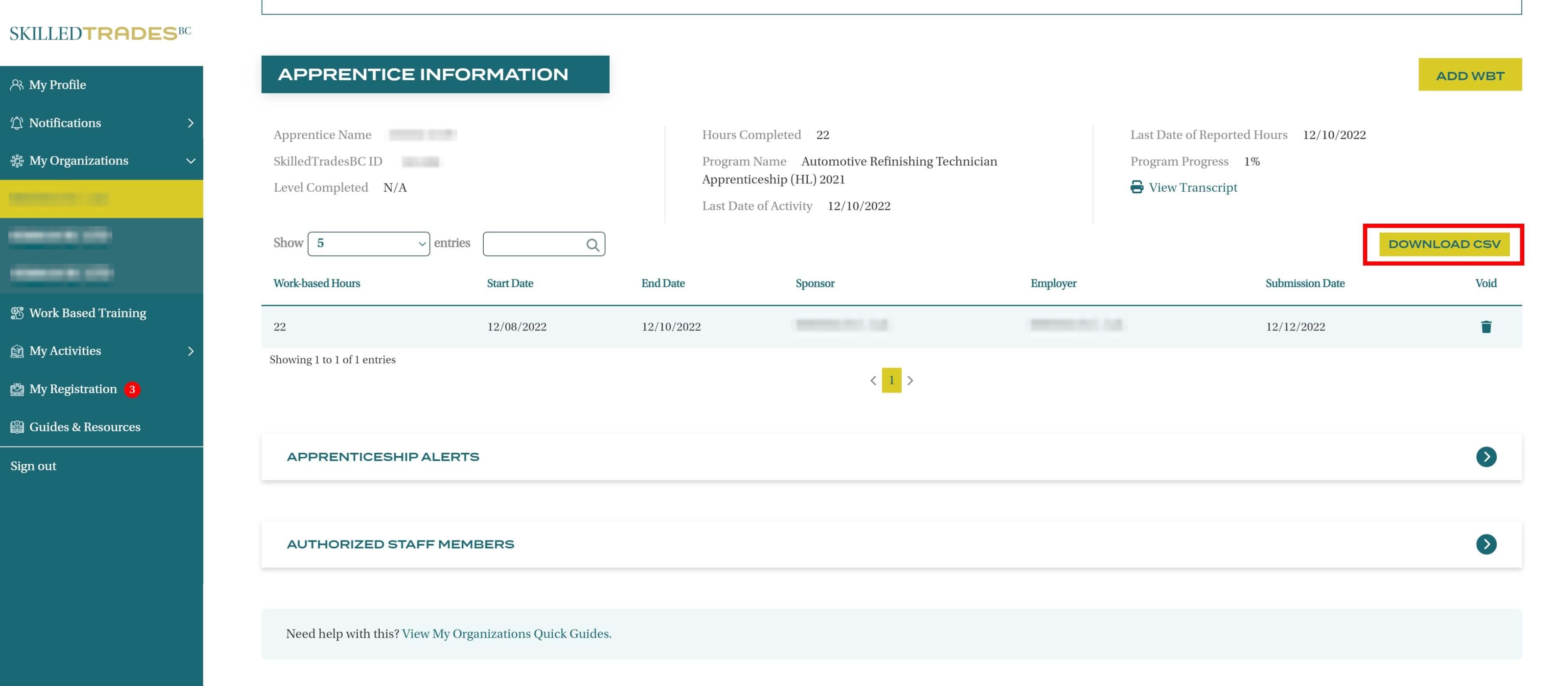 Sponsors also have an option to download work-based training CSV for the selected apprentice.
