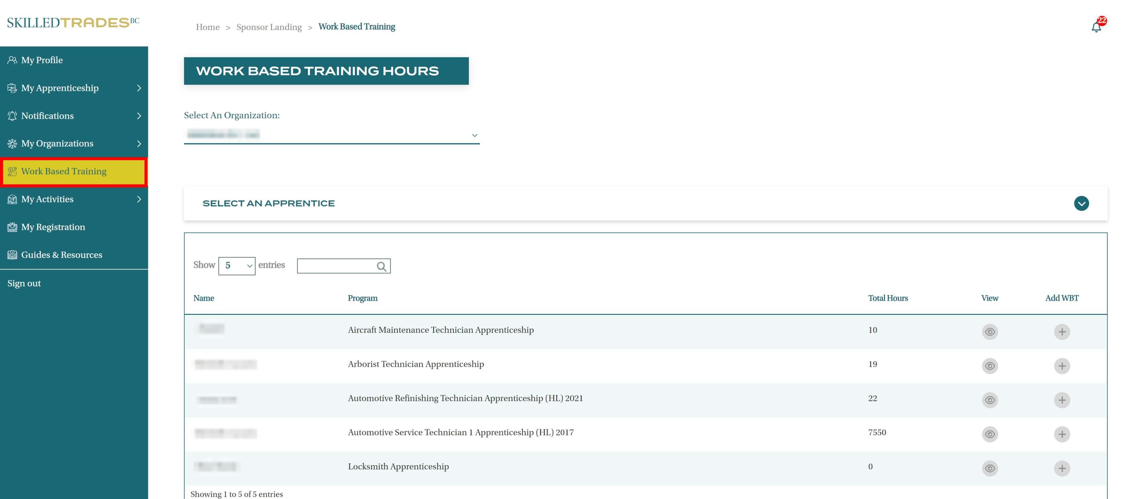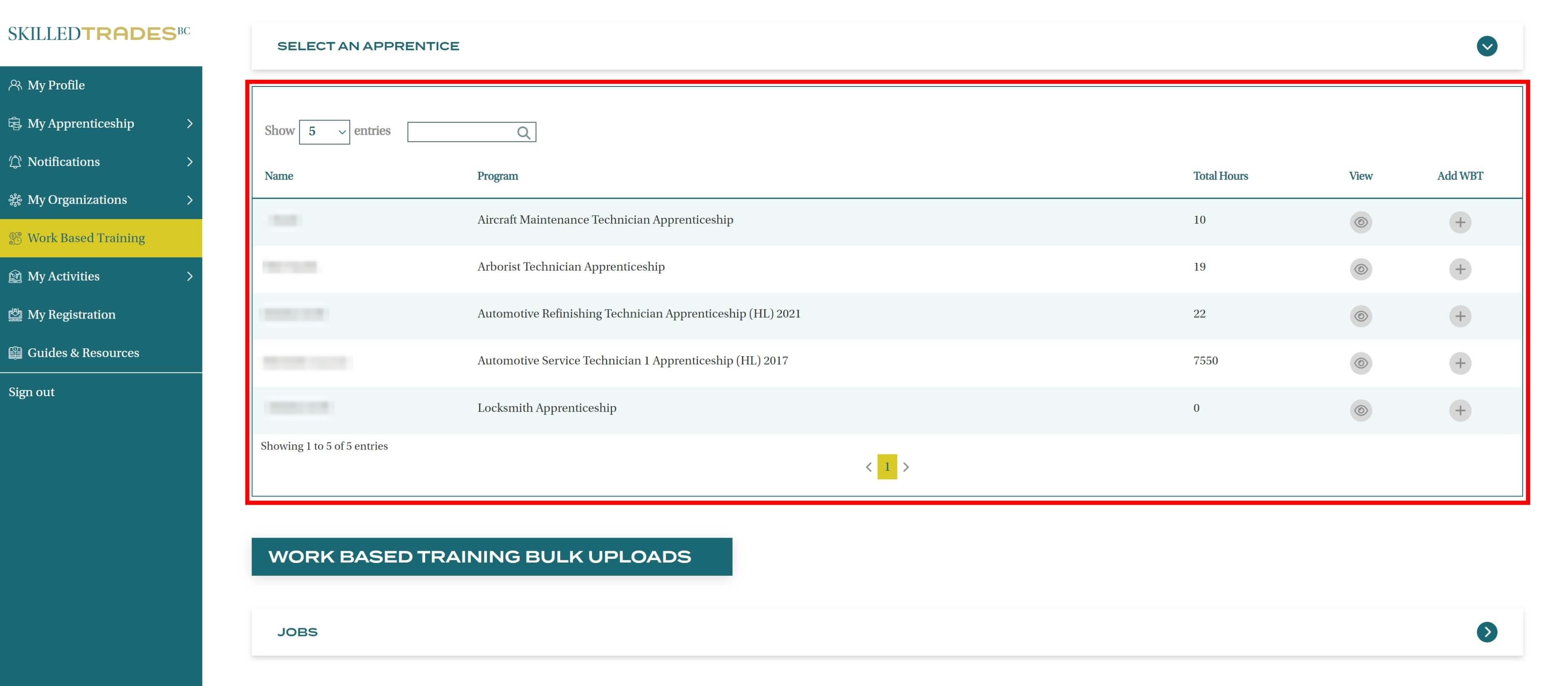 Navigate to the Work-Based Training section of the dashboard. A list of apprentices is presented. click on the “eye” icon under View to see the apprentice’s details.