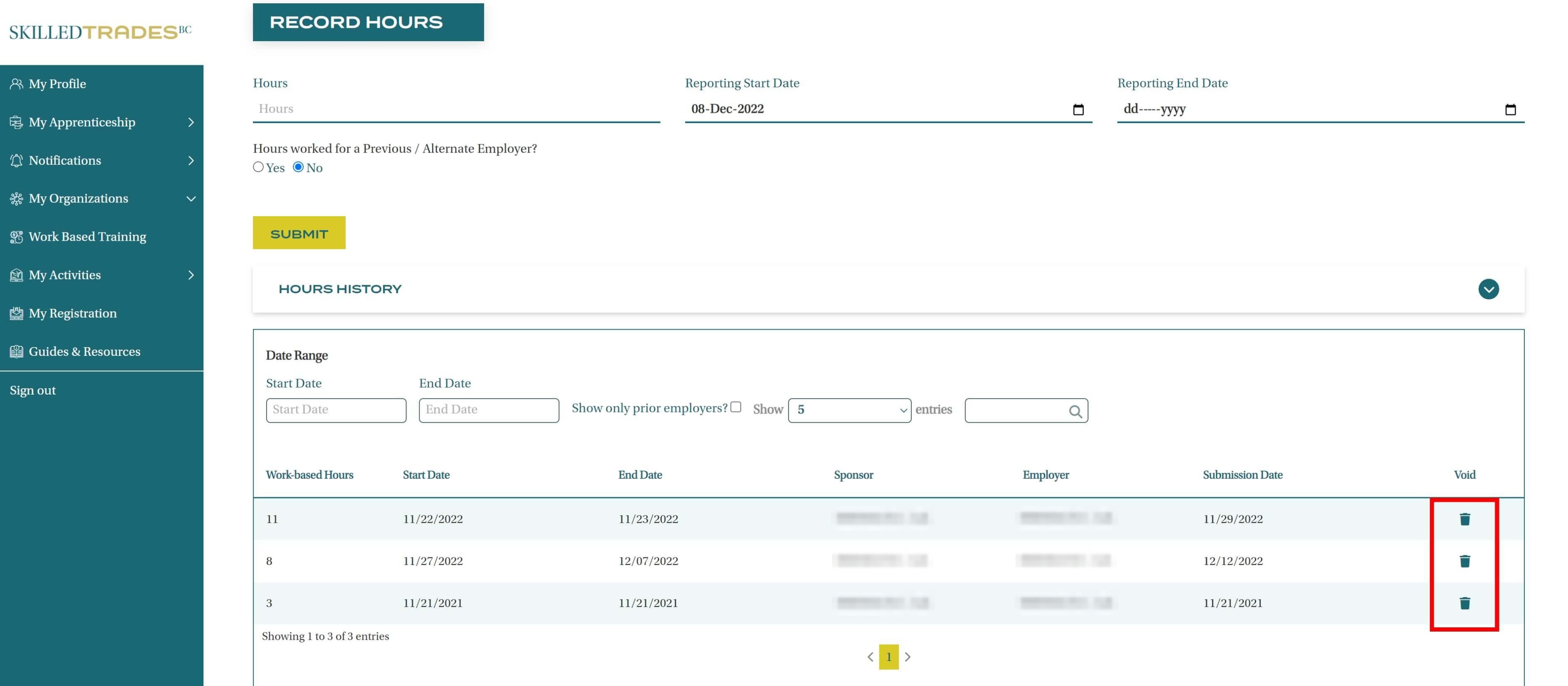 Upon submission, if sponsors have an option to void the selected hour submission. They can do so by clicking on the “bin” icon under Void.