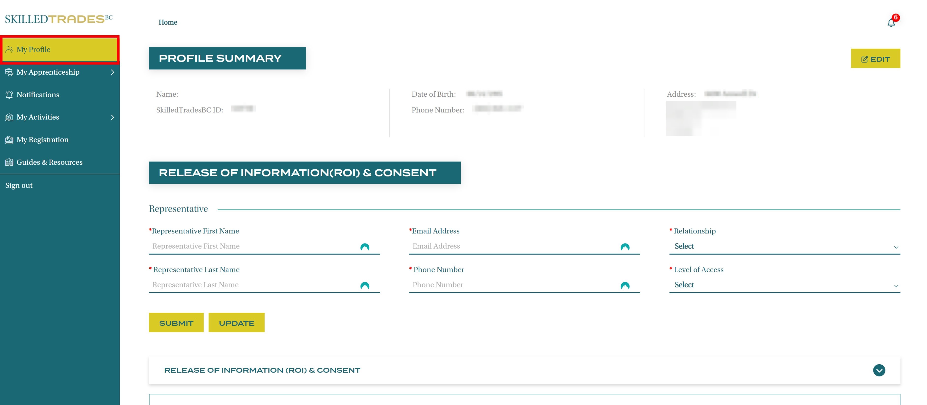 Consent – Allows the SkilledTradesBC to release information to the authorized representative and the authorized representative can edit/update the apprentice’s information.