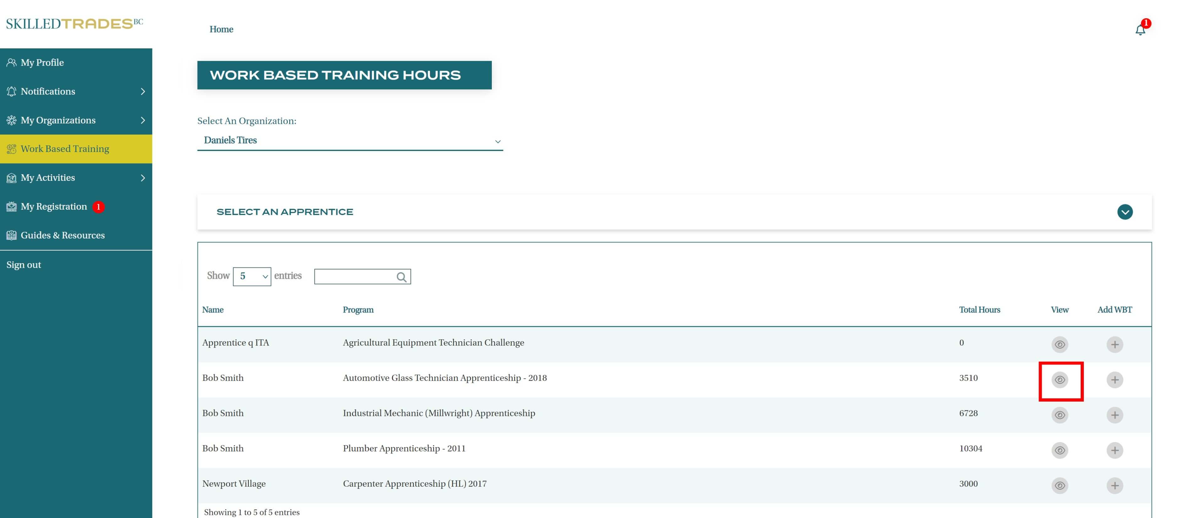 Click on the “eye” icon under view to see the selected apprentice’s details.