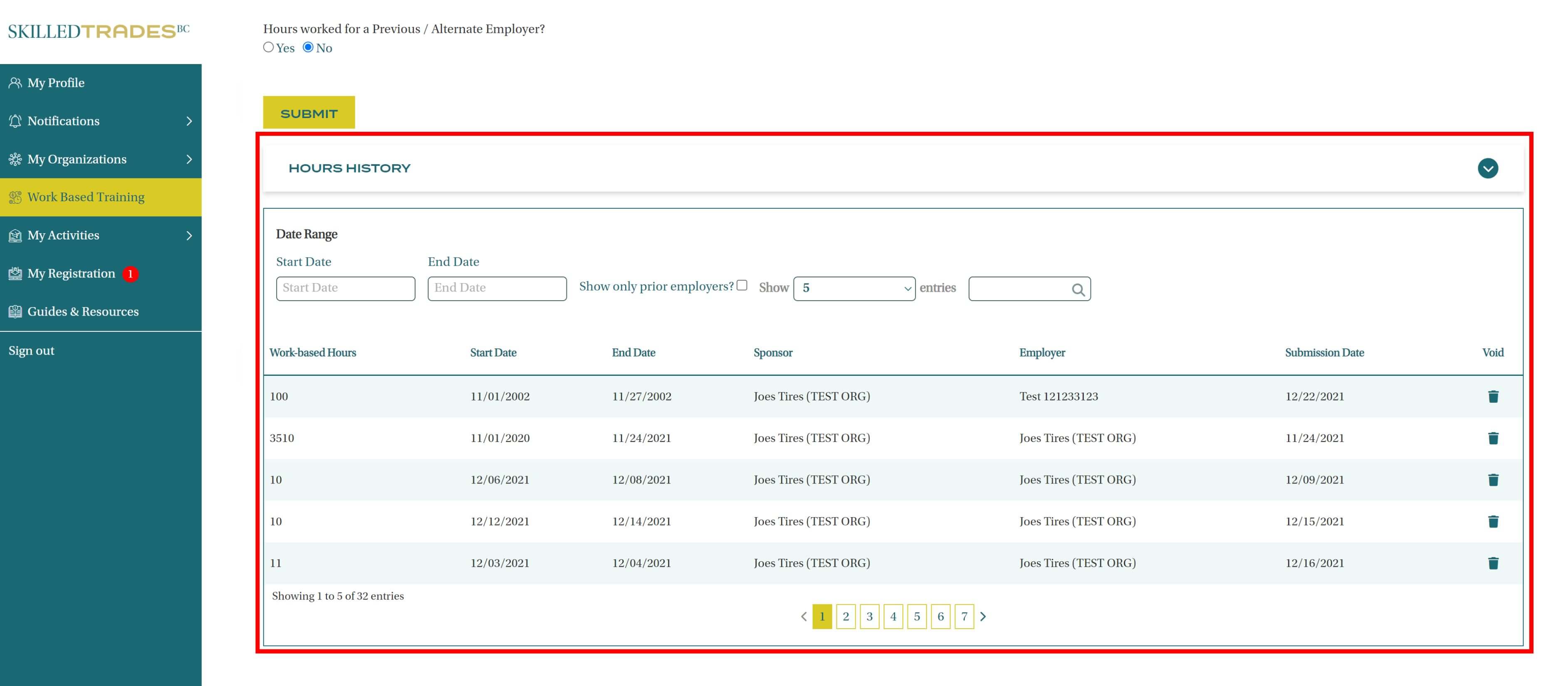 The apprentice’s hours breakdown is given wherein users can search for a specific date range or sort the information as needed.