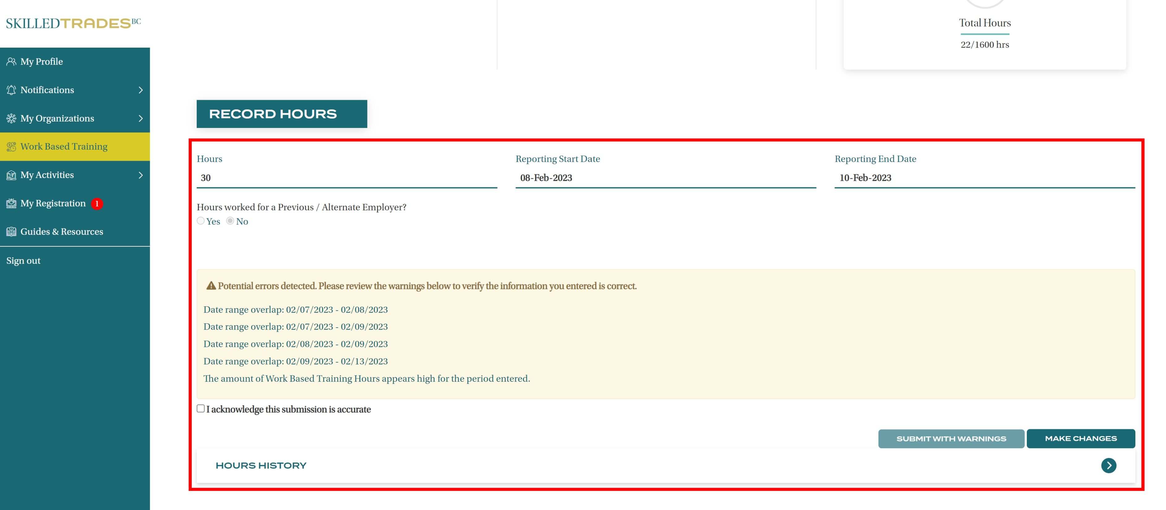 If the user is certain that the details are correct, they may submit the hours when a warning is displayed by acknowledging that the submission is accurate.