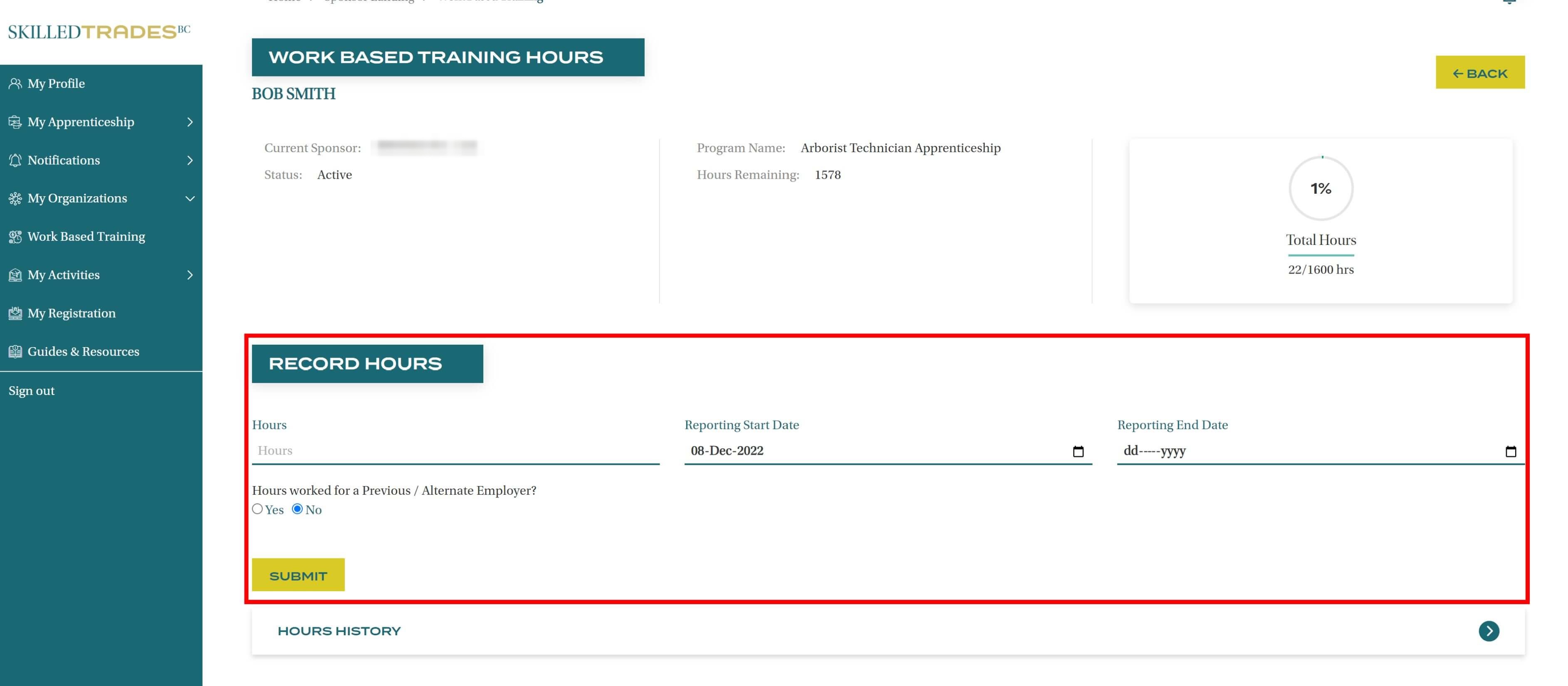 Navigate to the Work-Based Training section in the SkilledTradesBC portal.