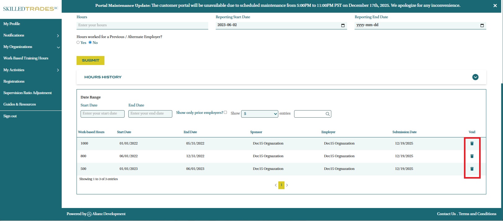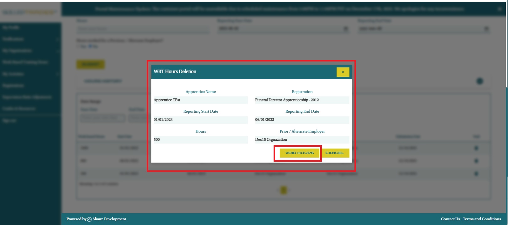 - You will see a pop-up appear. After reviewing the information, click “Void Hours” to delete the work-based training hours submission.