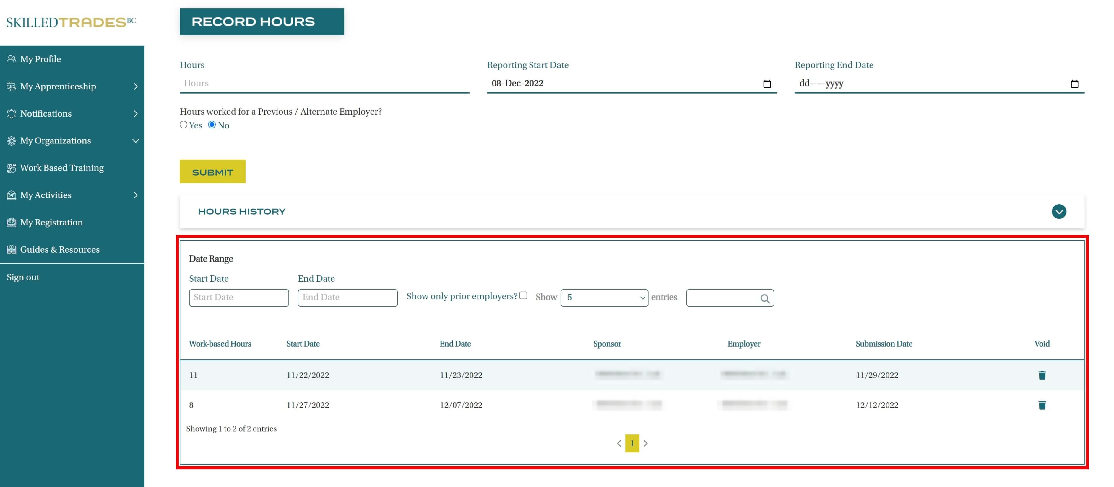 View Hours History and breakdown of hours submitted by the employer for the selected apprentice. An option to void the selected submission and Download CSV.