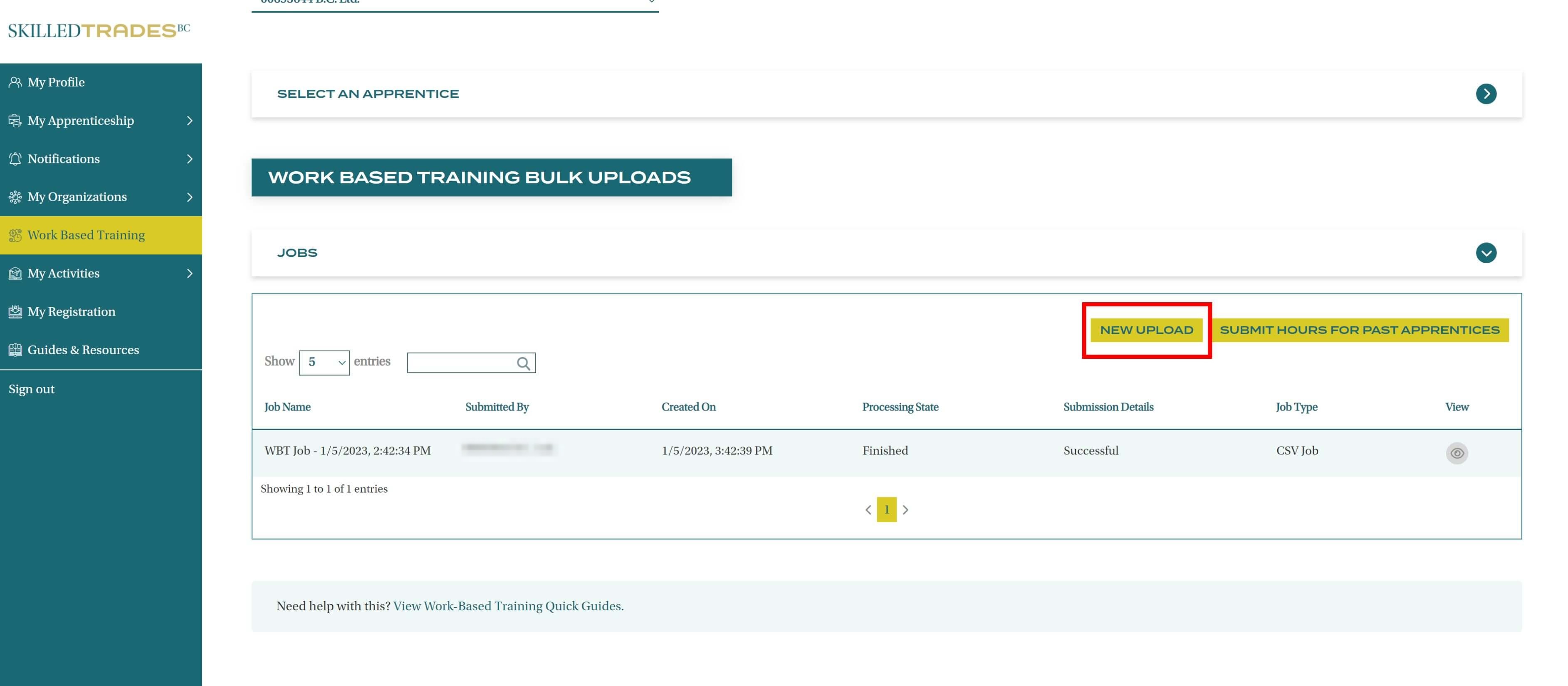 Navigate to the Work-Based Training section in the SkilledTradesBC portal.