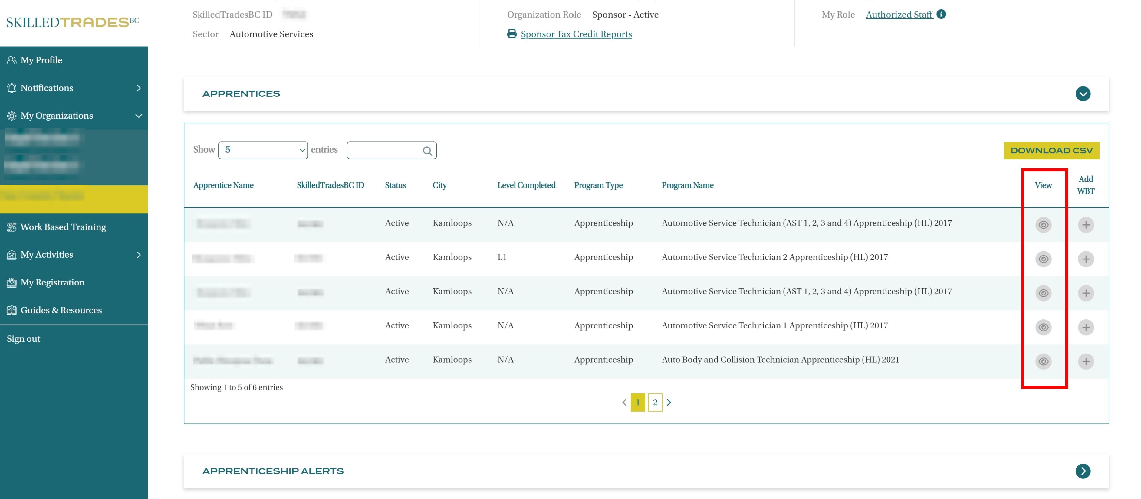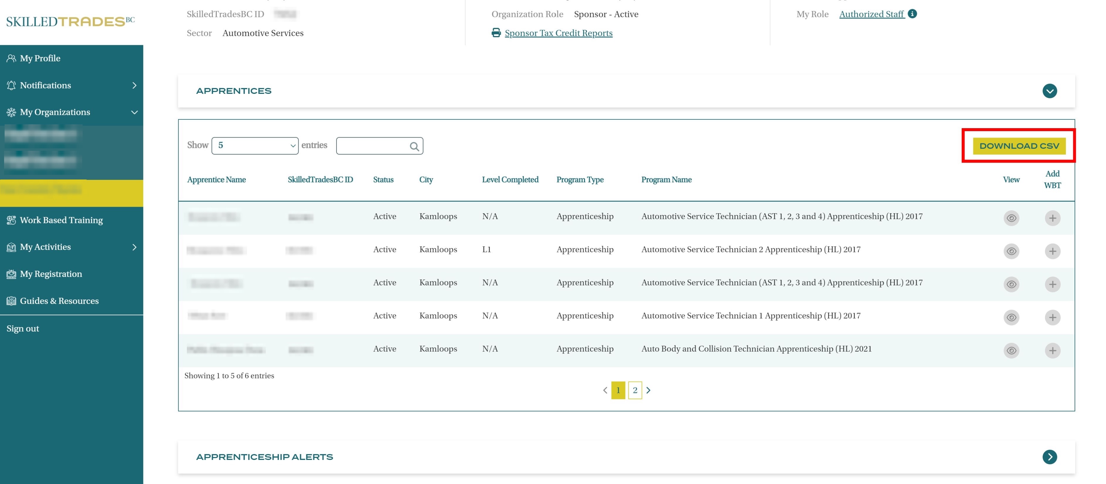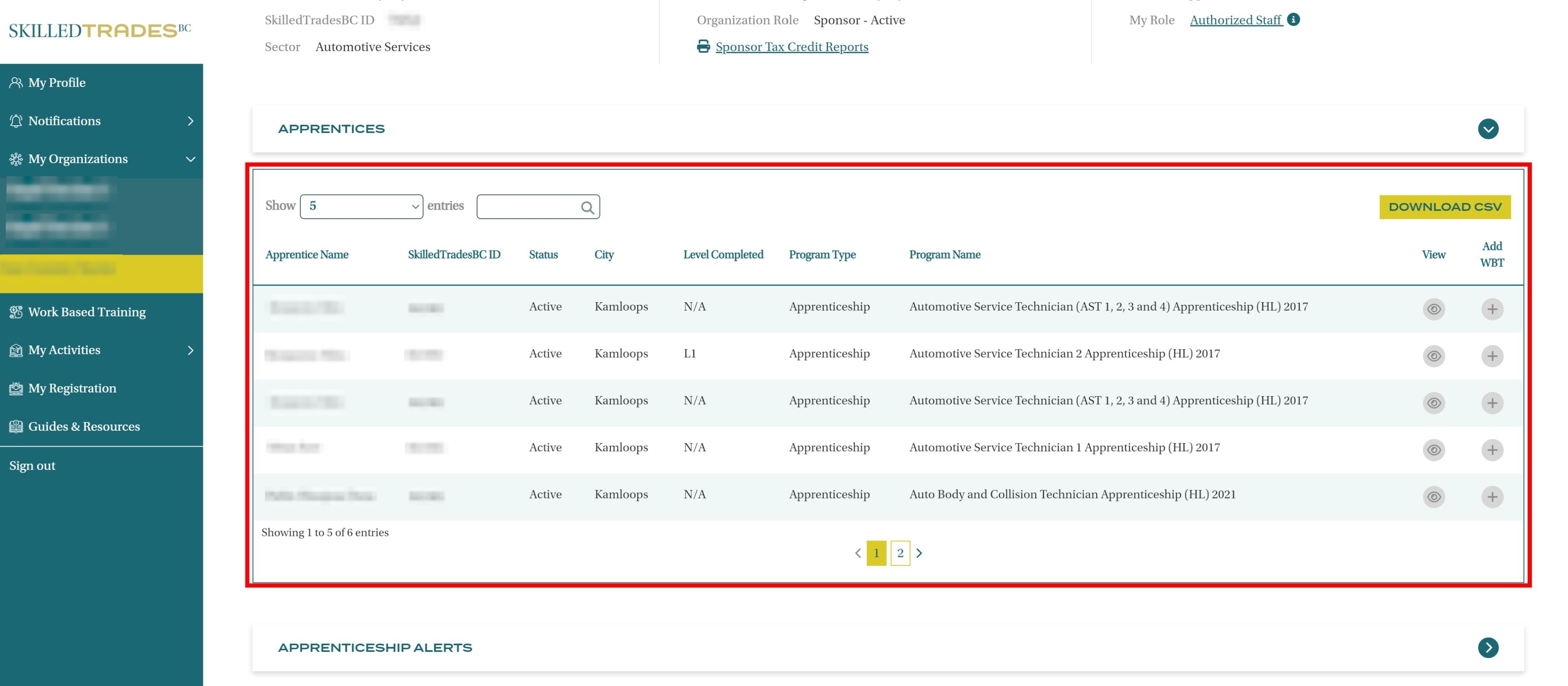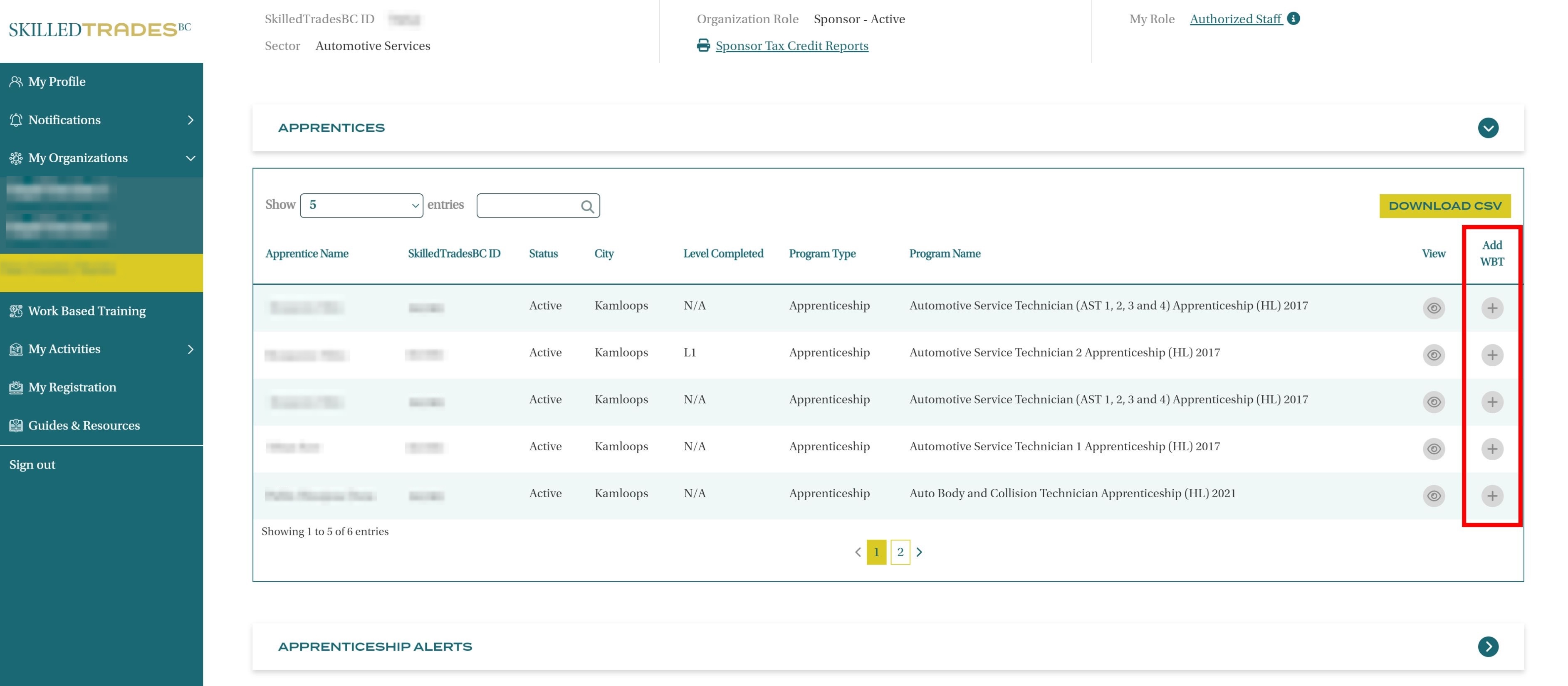 A list of Apprentices is displayed with Apprentice Name, SkilledTradesBC ID, Status, City, Level Completed, Program Type, Program name, Option to View Details and Add WBT Hours and Download WBT hours for all the apprentices within the organization.