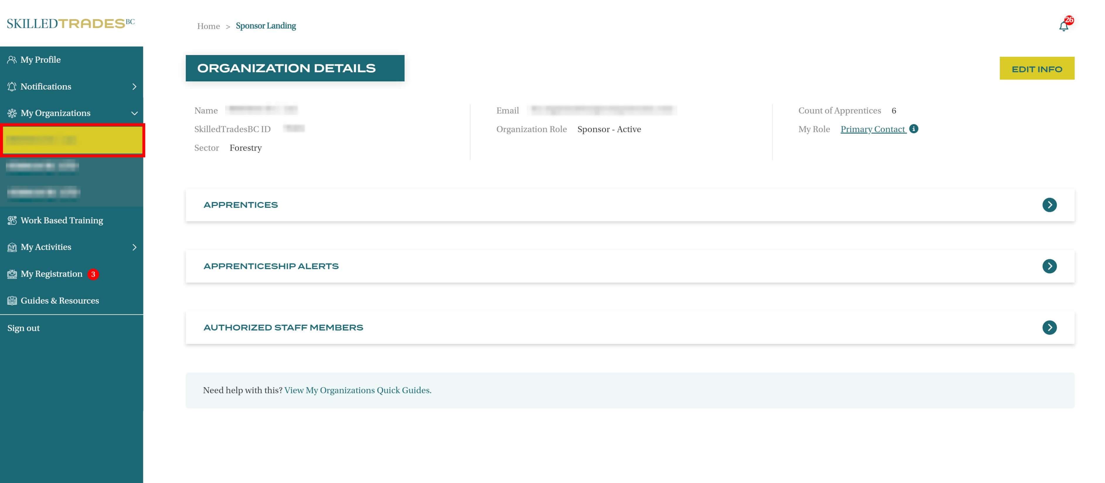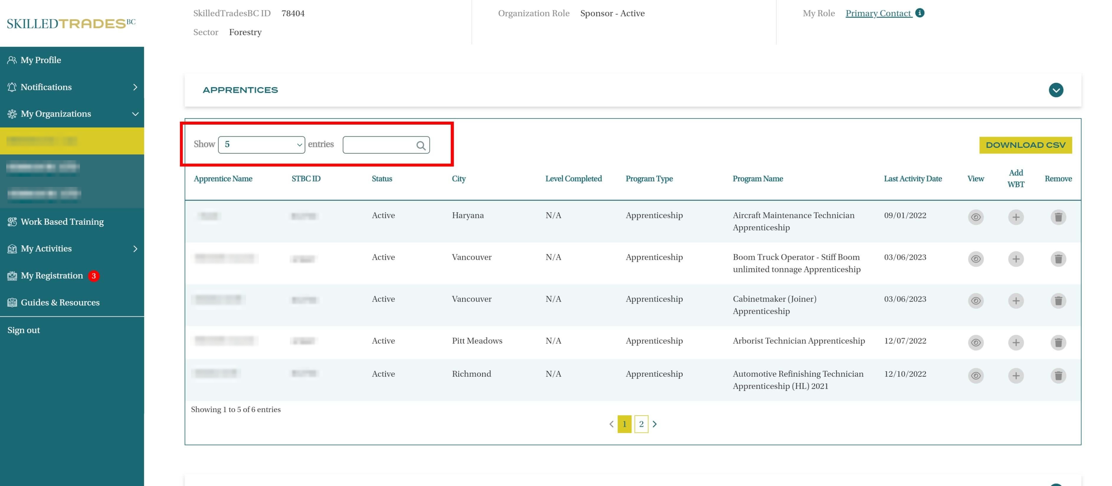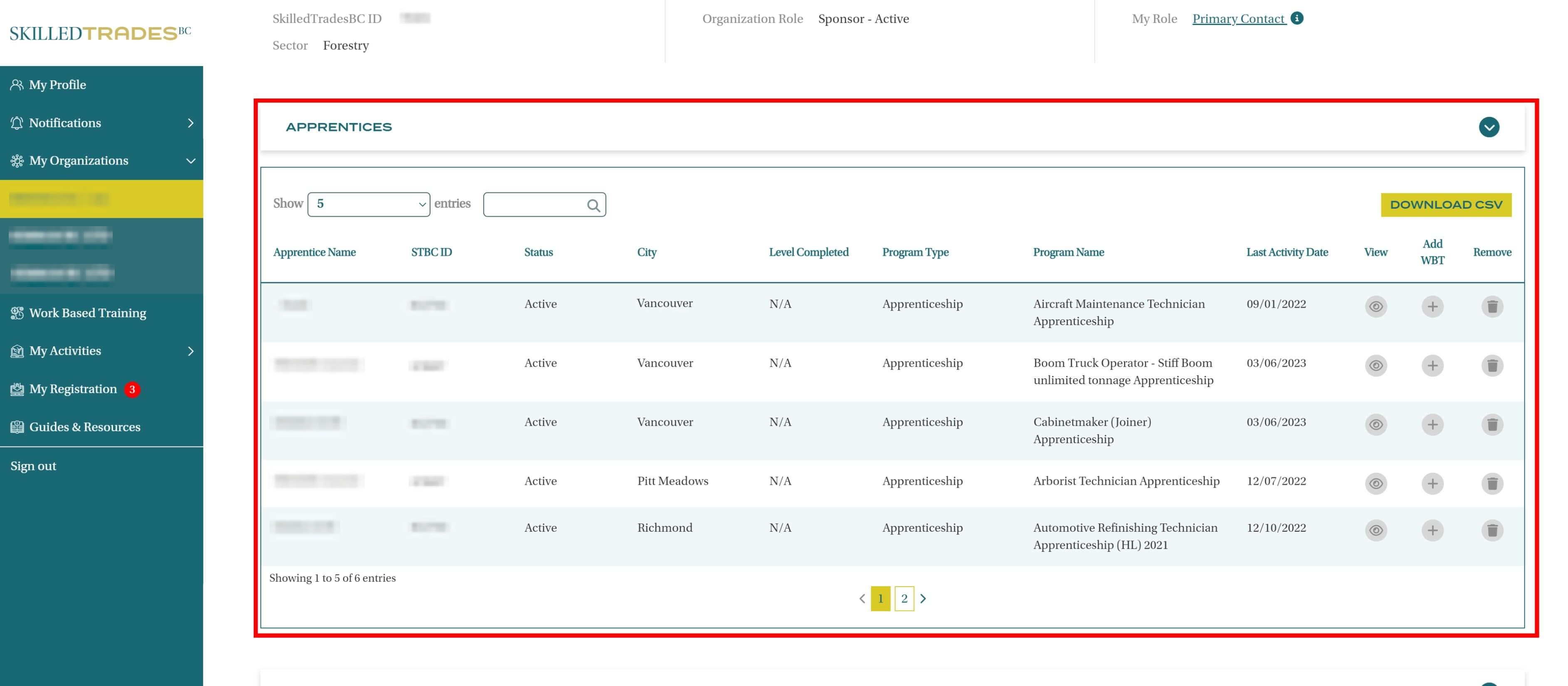 - The Apprentices table under the My Organizations section – This includes work-based training hours for all apprentices in the organization along with the apprentice’s details.