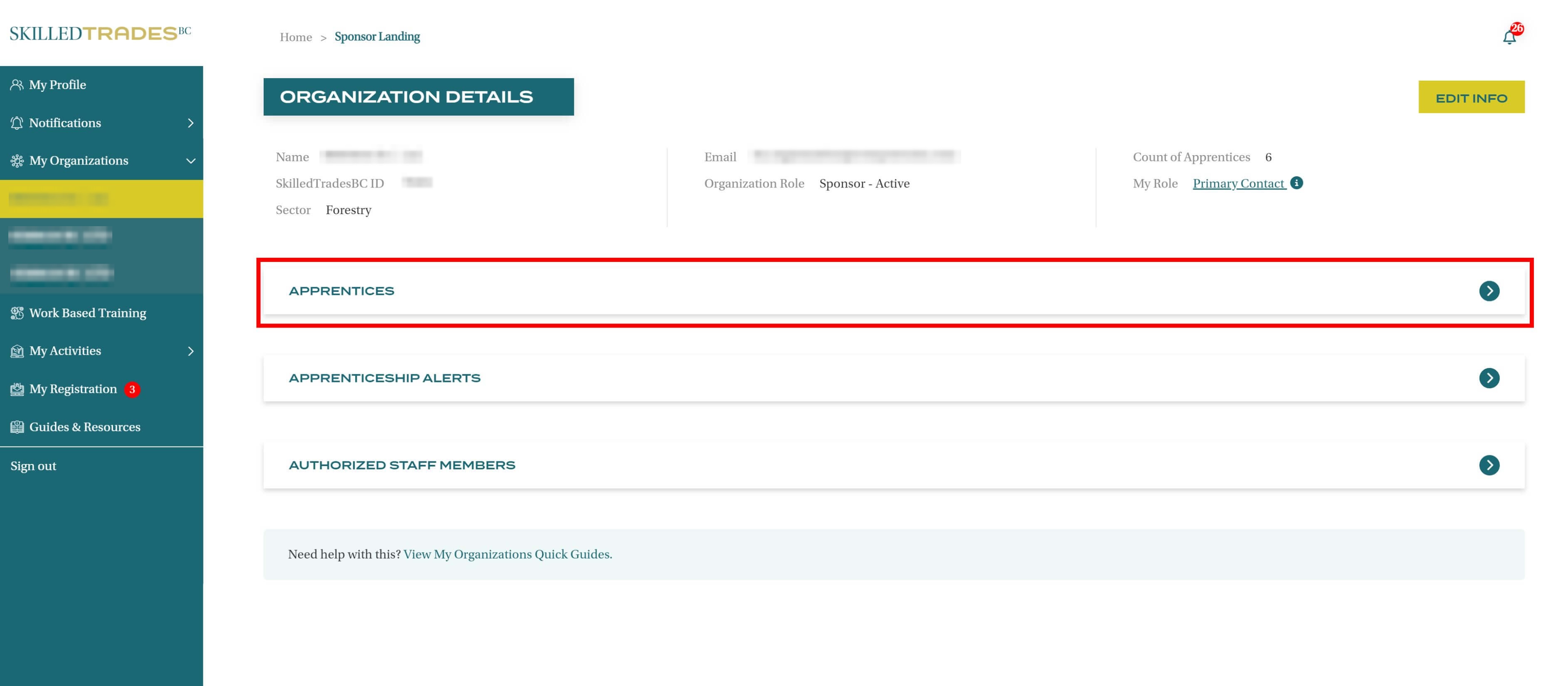 Click on the arrow next to Apprentices to expand the section to show a table with details of all the apprentices within the organization.