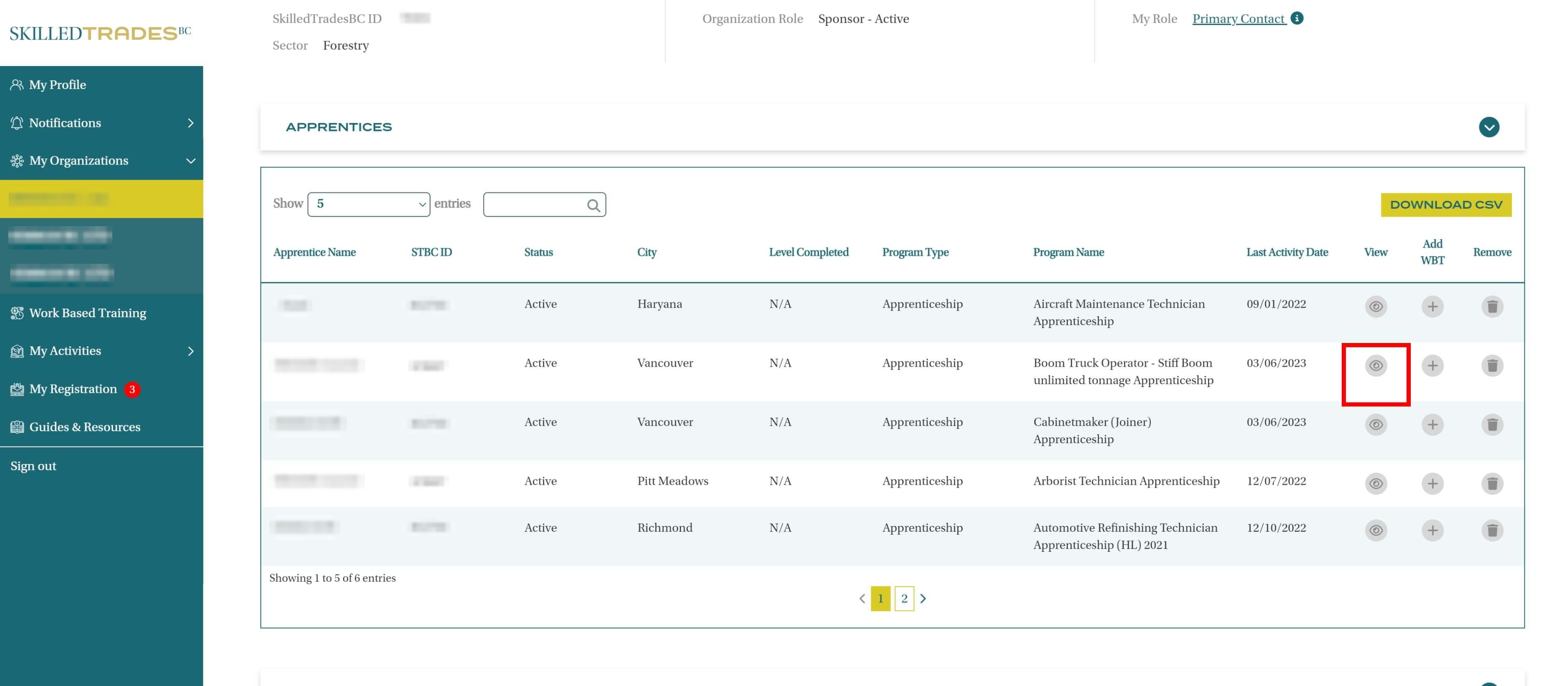 Click on the “Eye” icon next to the apprentice’s name to view the apprentice’s Work-Based Training table.