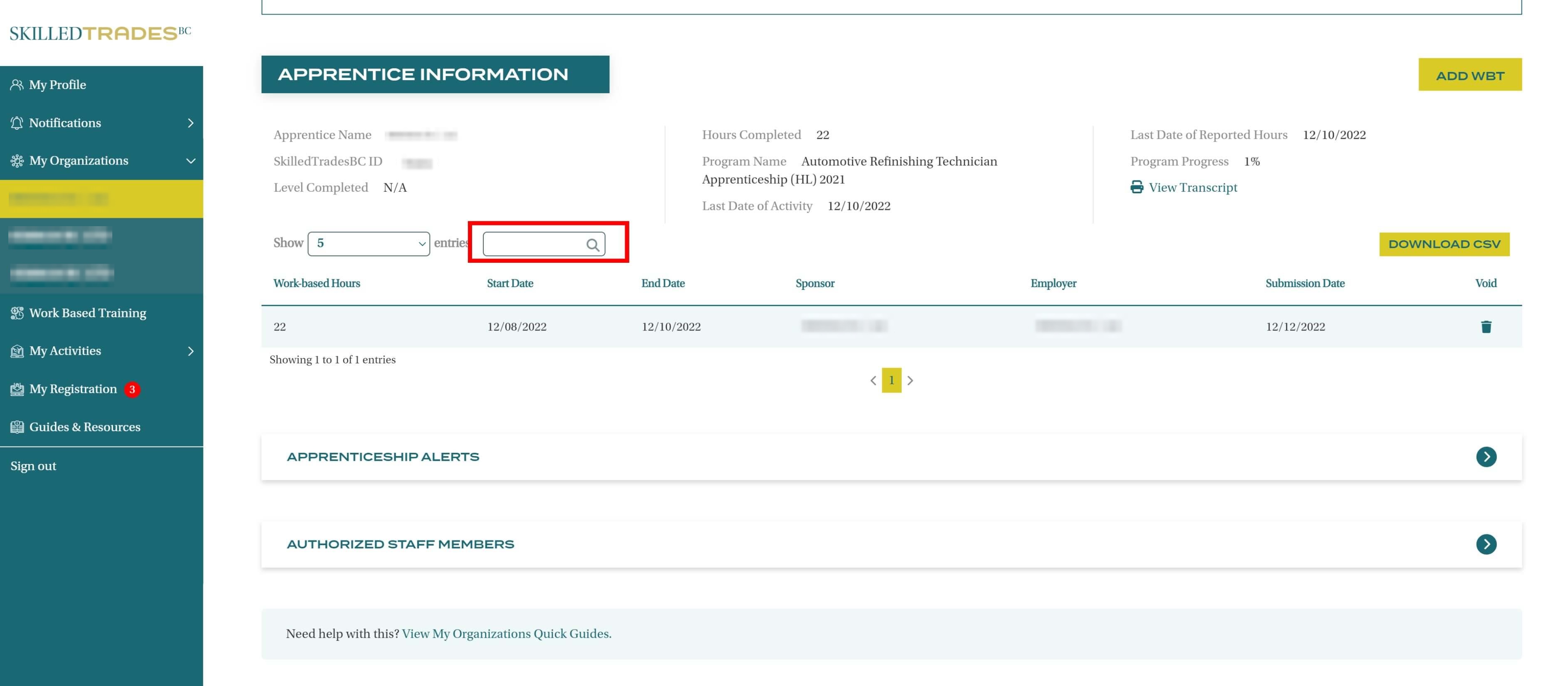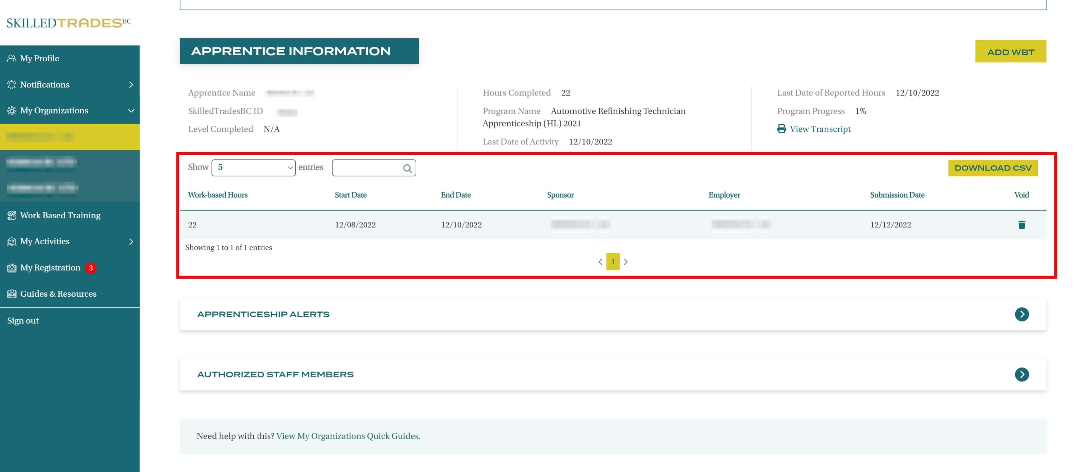 - The Work-Based Training table under the My Organizations section – This includes work-based training hours for a selected apprentice.