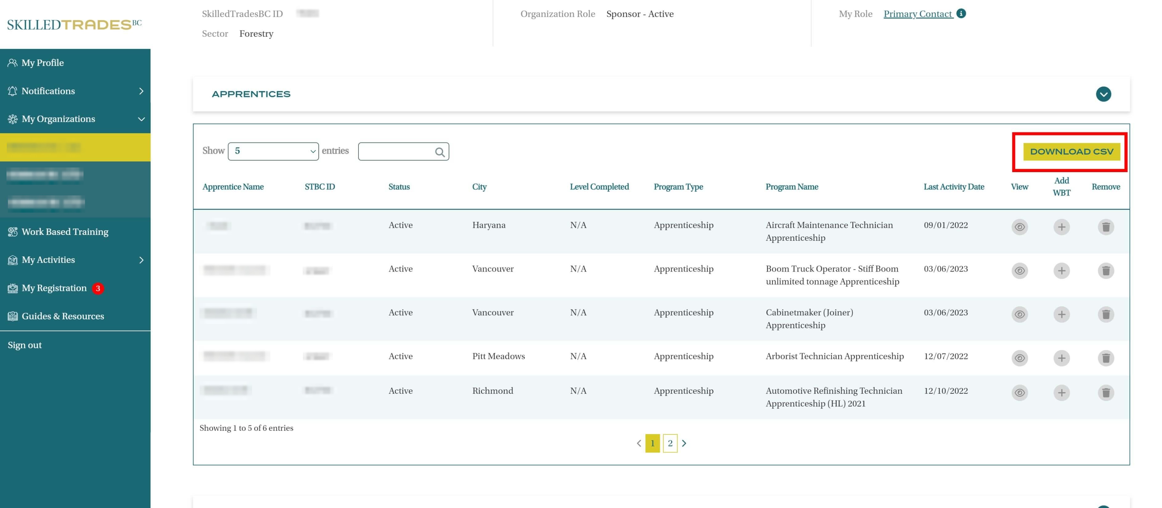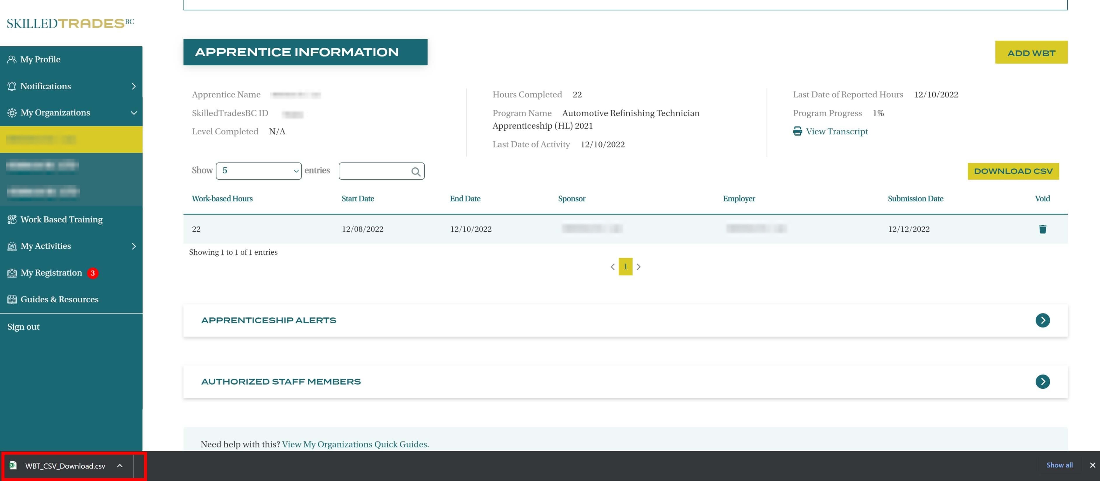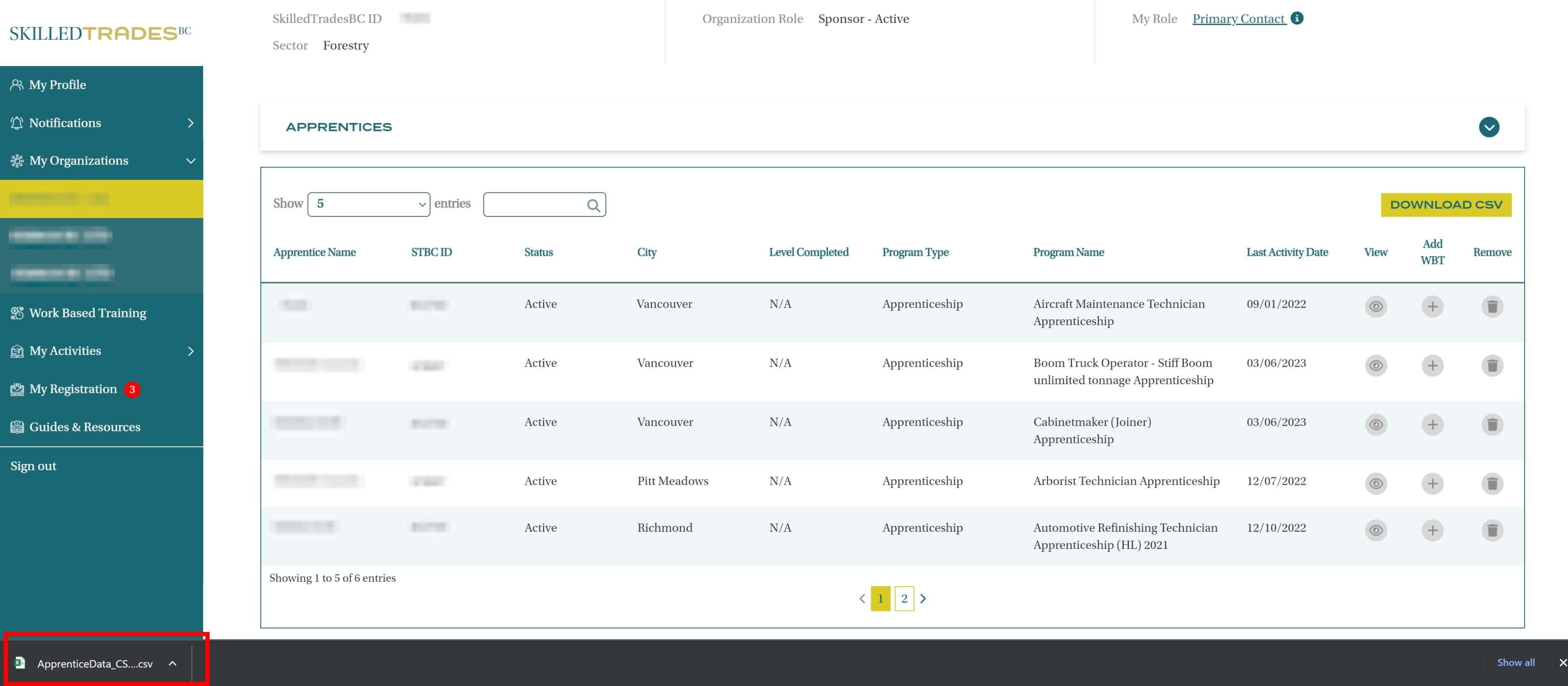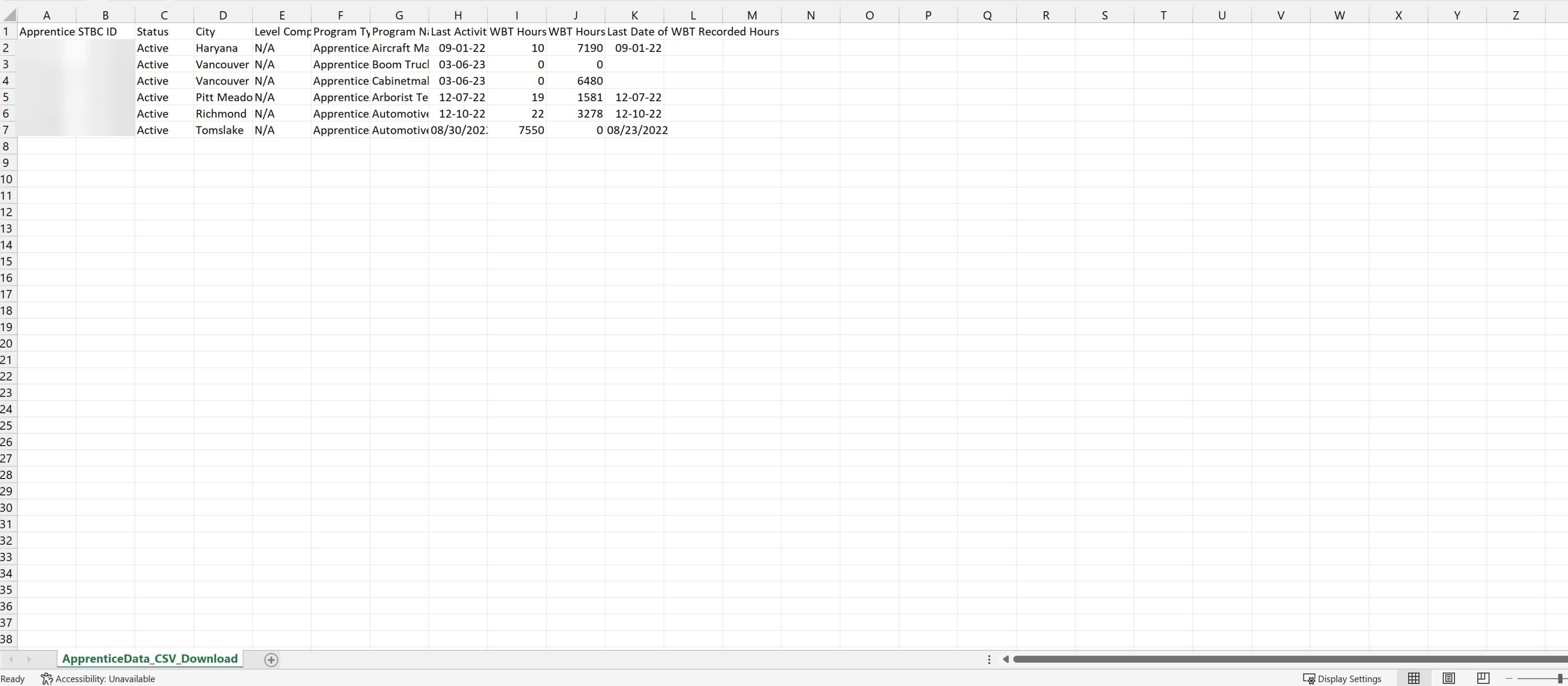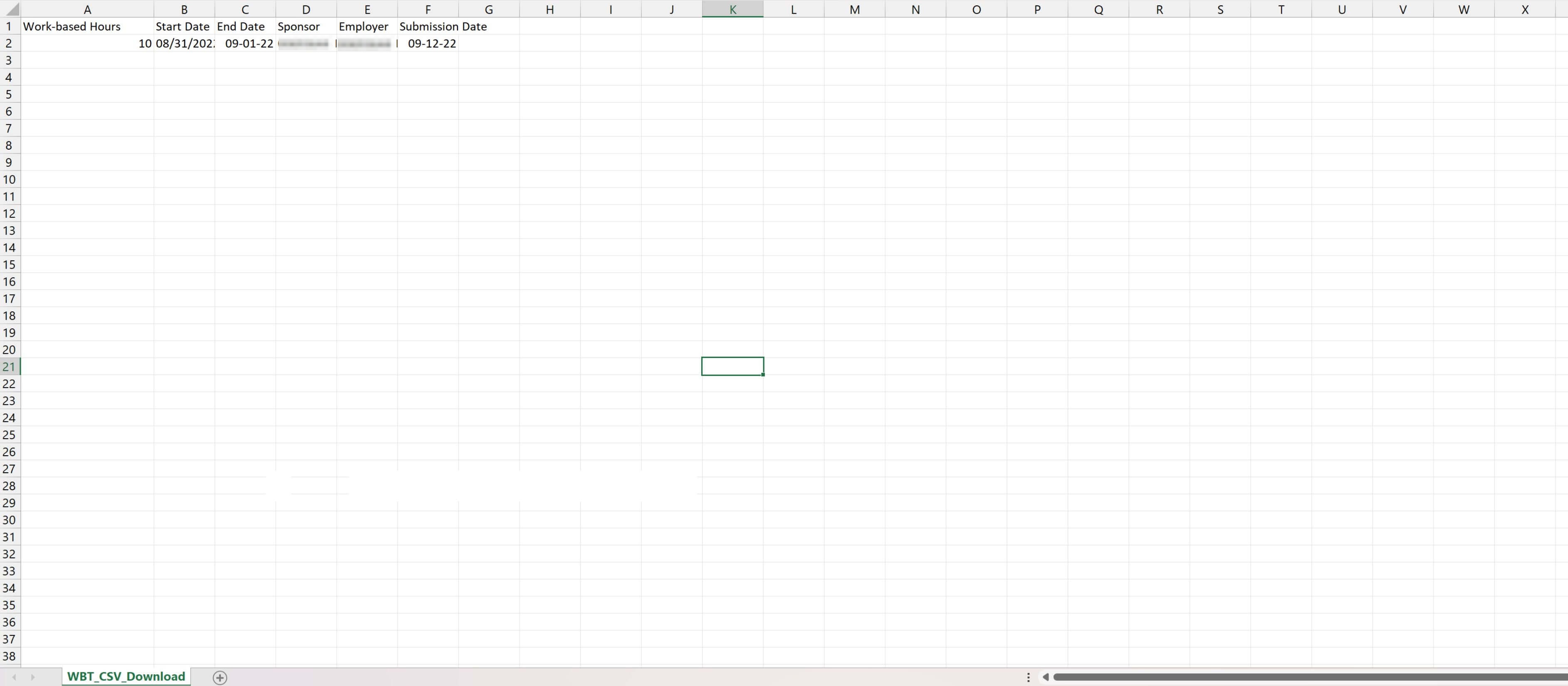 Sponsors can download work-based training records as .CSV (comma-separated files) spreadsheet files directly from the portal.