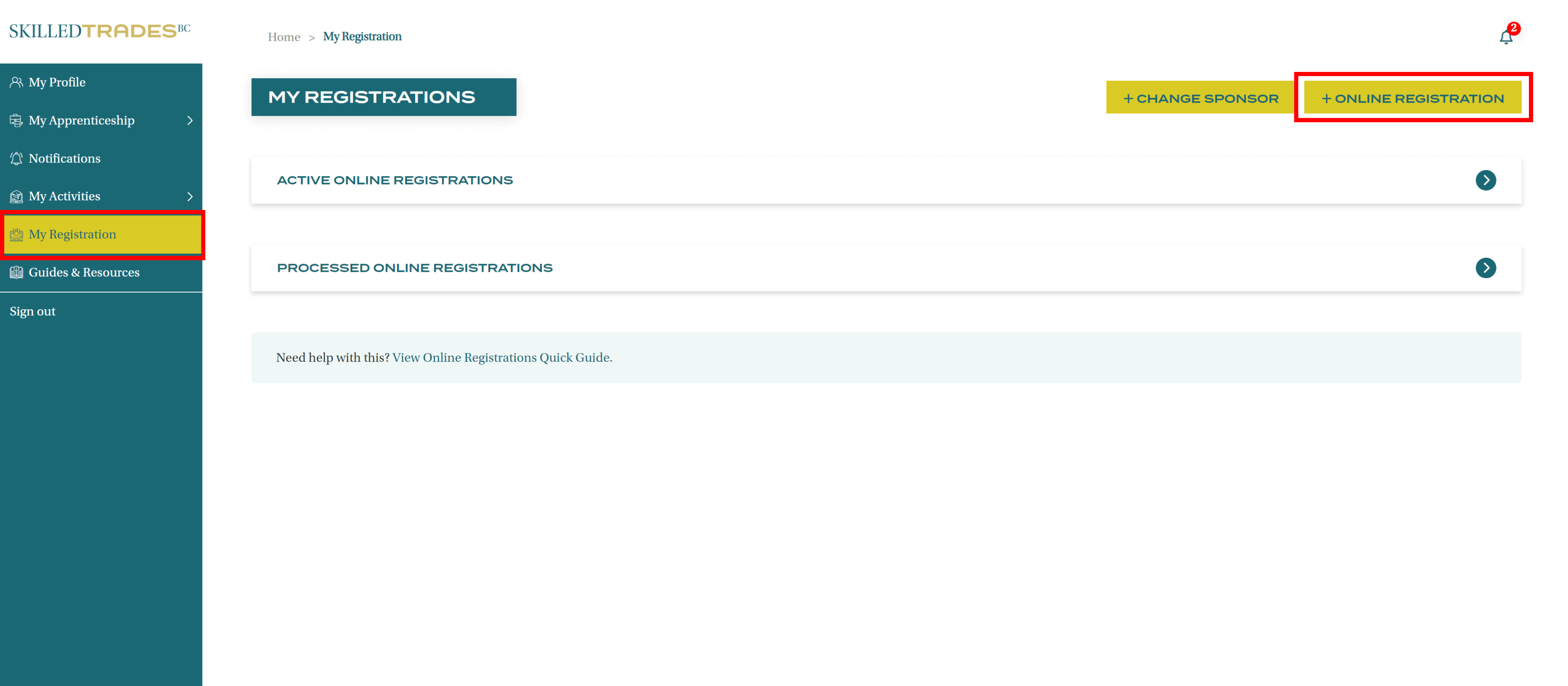 To start the registration process, apprentices can navigate to the My Registration section on the left side of the SkilledTradesBC Portal dashboard.
