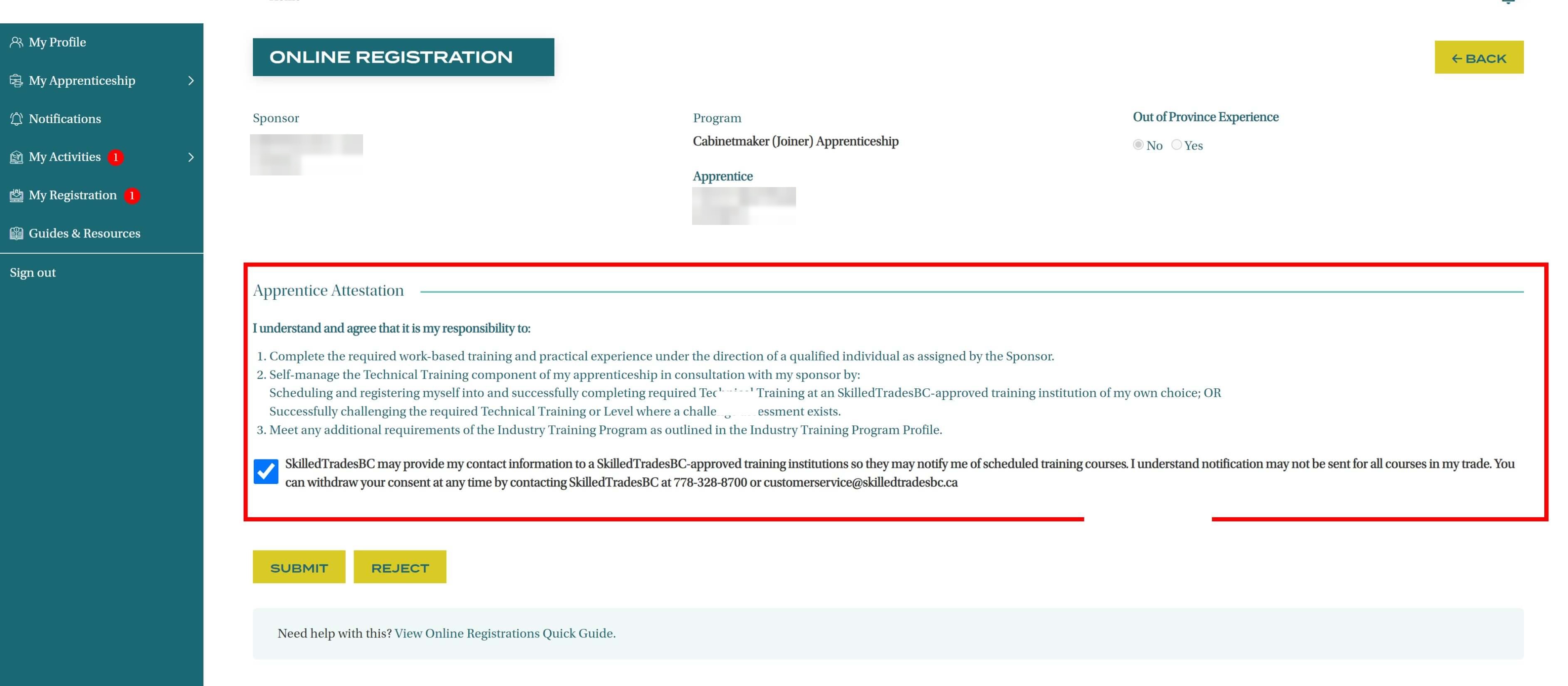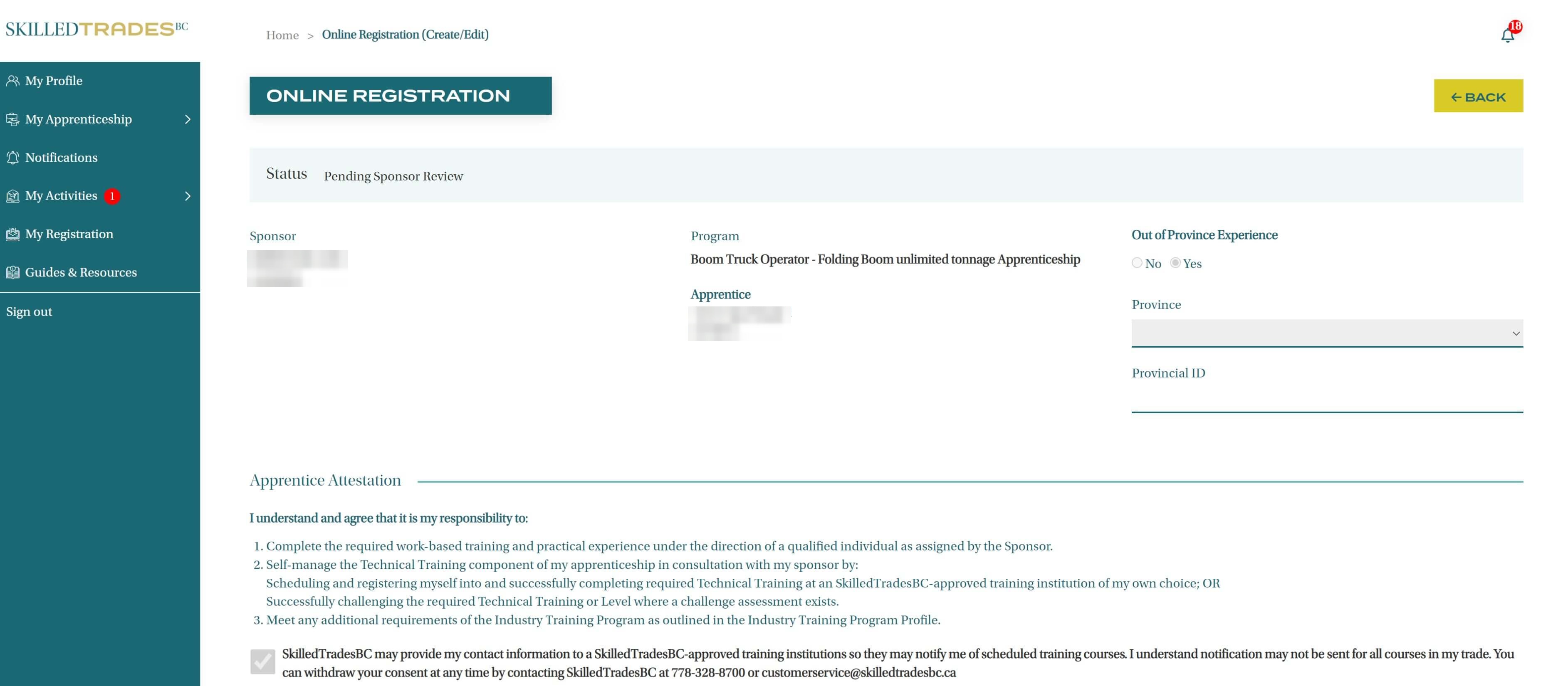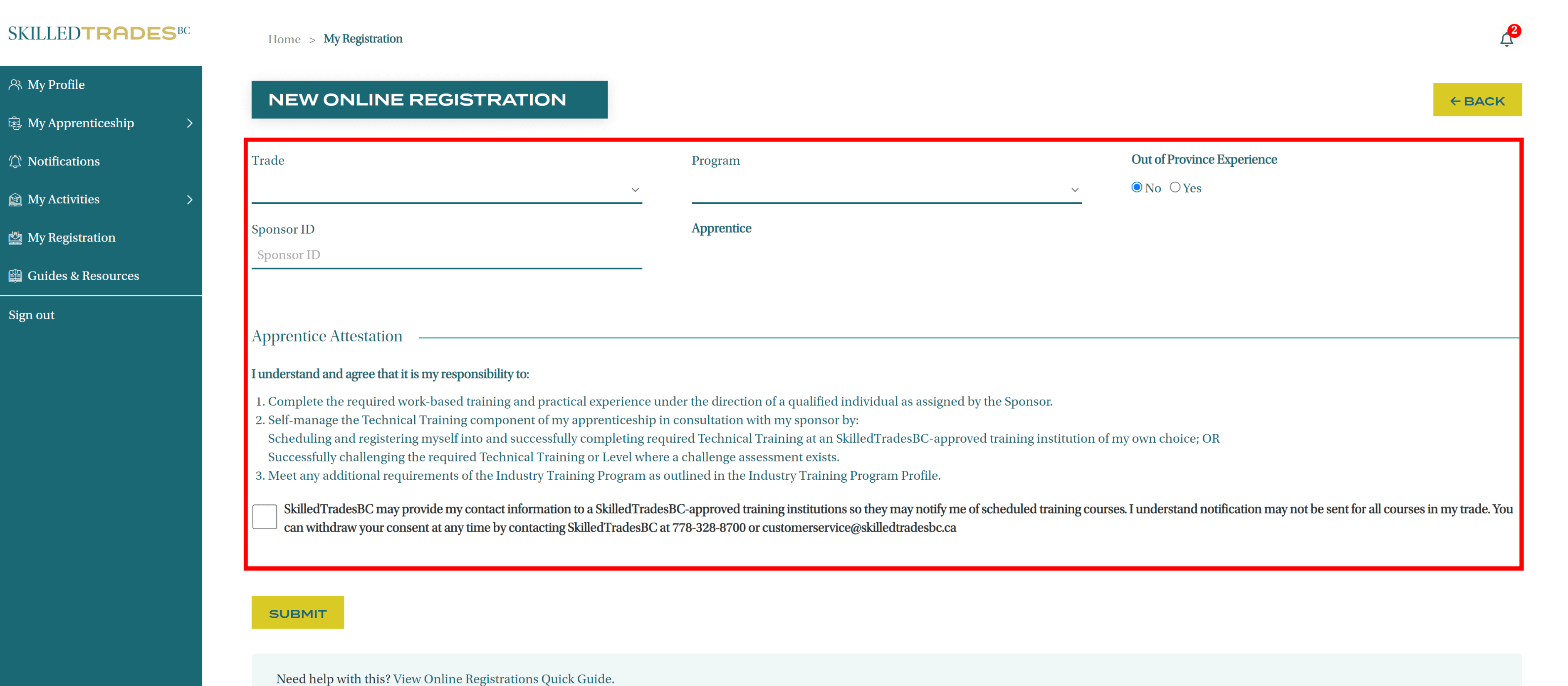 If an apprentice has the sponsor organization’s SkilledTradesBC ID, they may initiate the process through the Online Registration section in the Portal. Upon completing the registration, the respective sponsor will be notified to review and approve/deny the apprentice’s registration request.