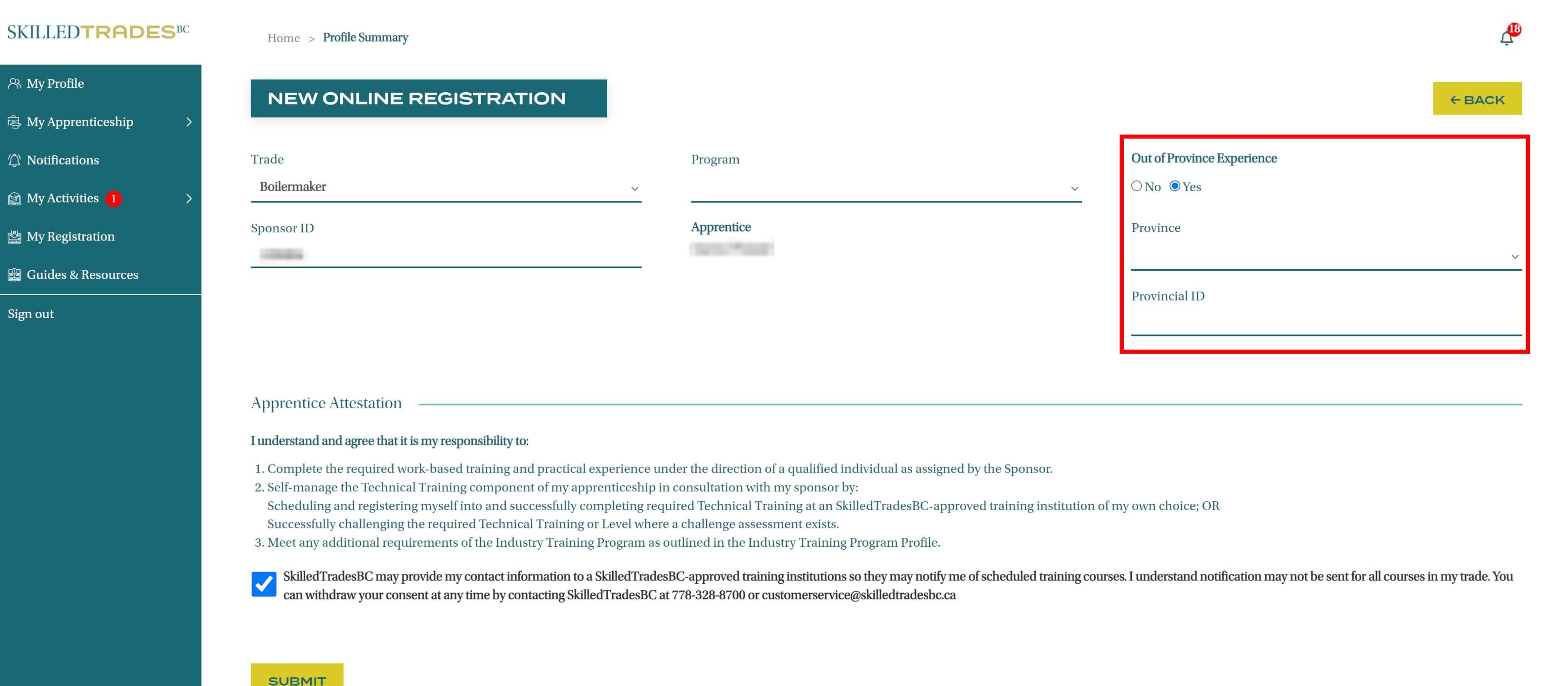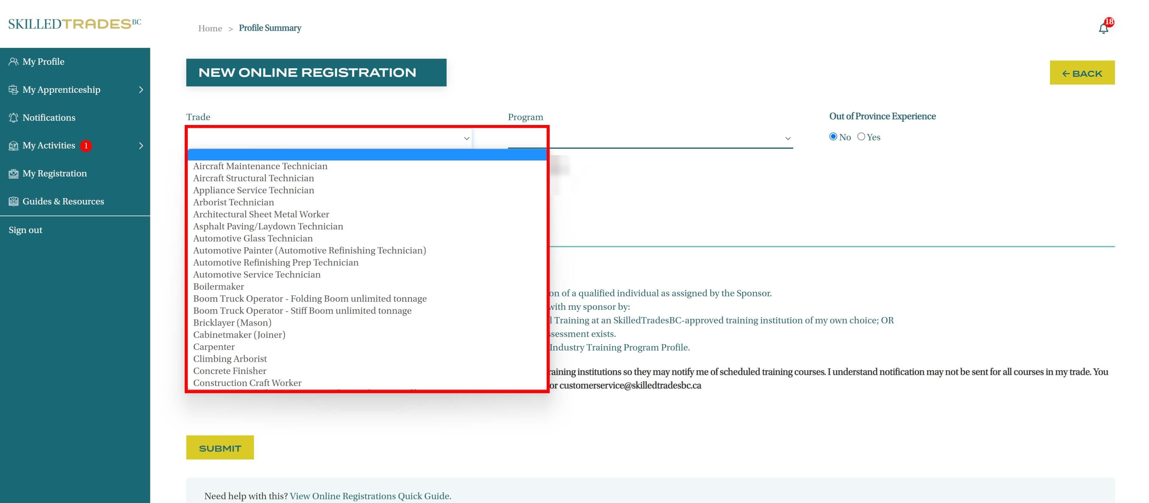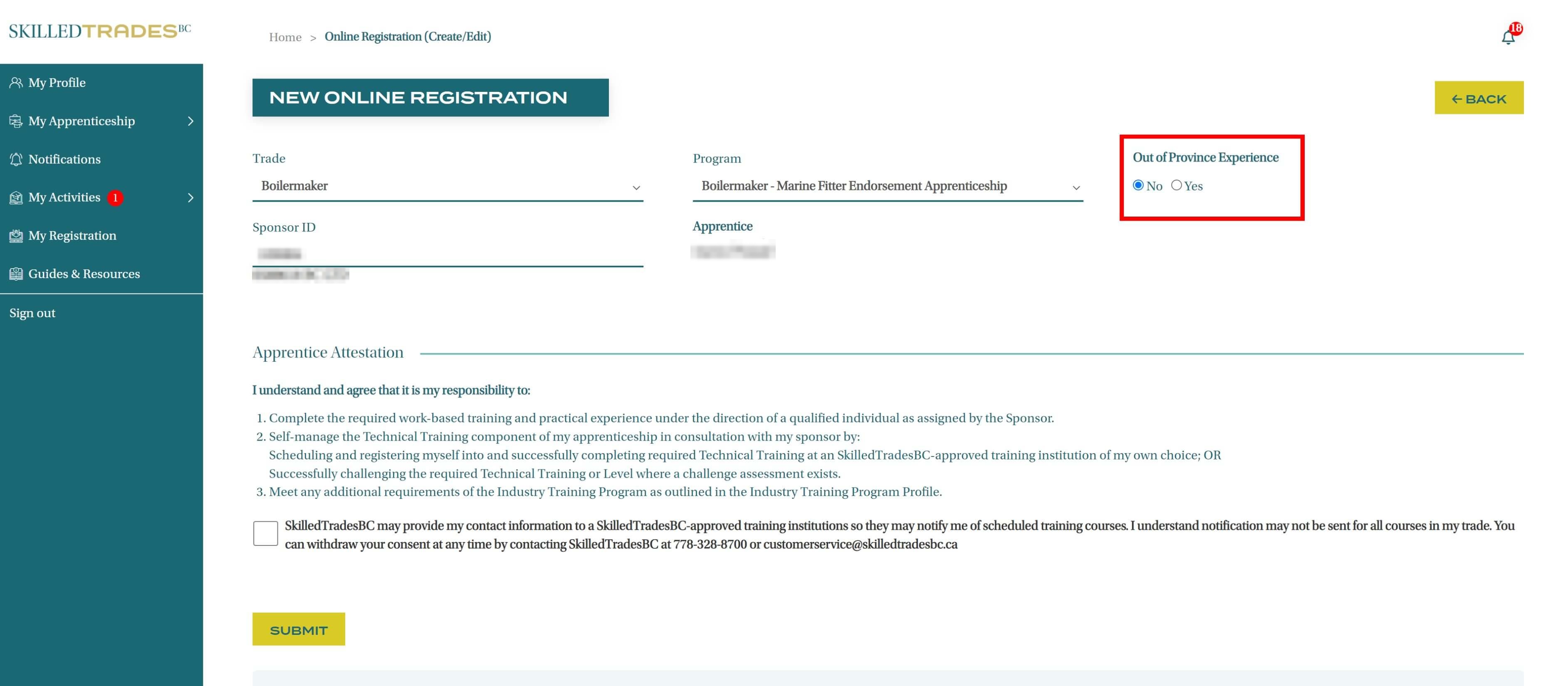 If an apprentice has the sponsor organization’s SkilledTradesBC ID, they may initiate the process through the Online Registration section in the Portal. Upon completing the registration, the respective sponsor will be notified to review and approve/deny the apprentice’s registration request.