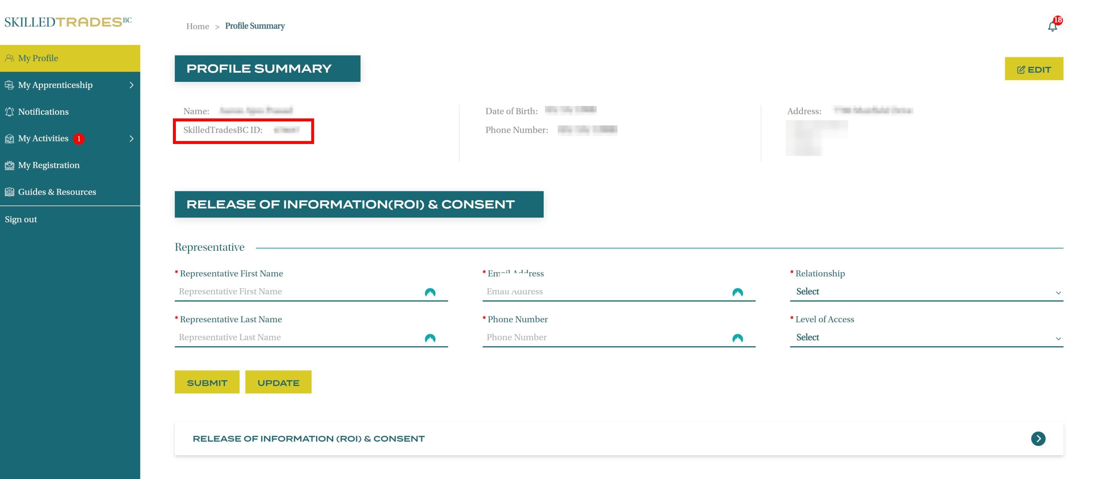 Apprentices can find their SkilledTradesBC ID under the My Profile section of the Portal.