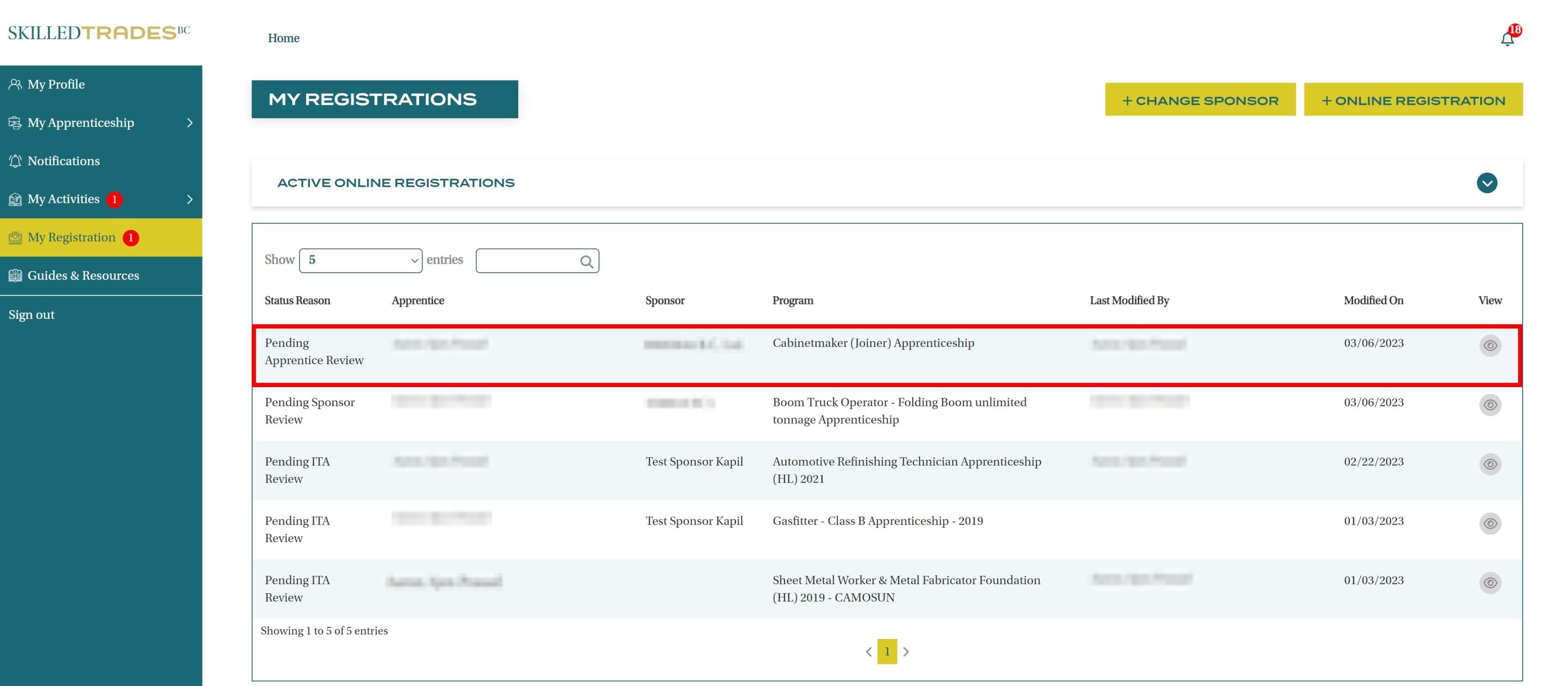 The registration request appears under the Active Online Registrations table. Apprentices can view the following information: