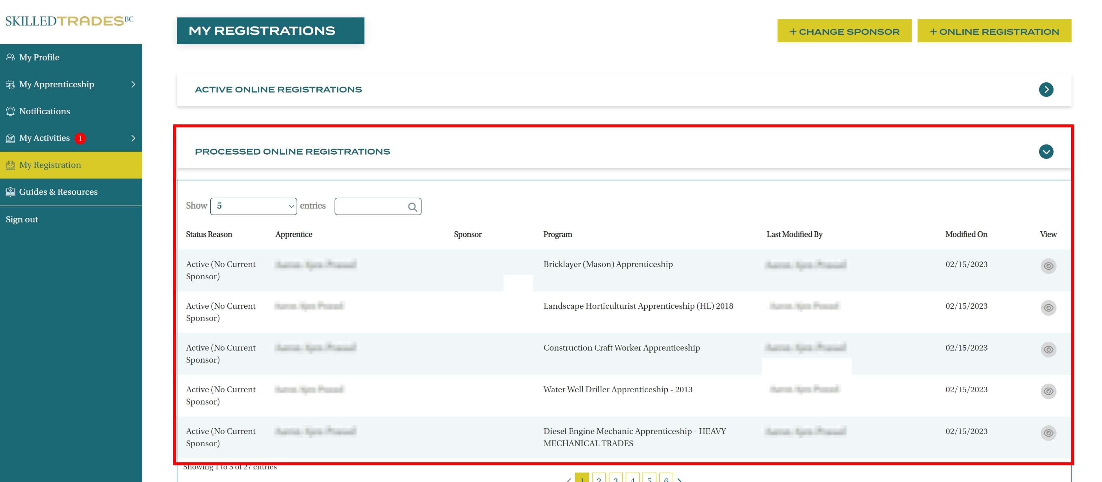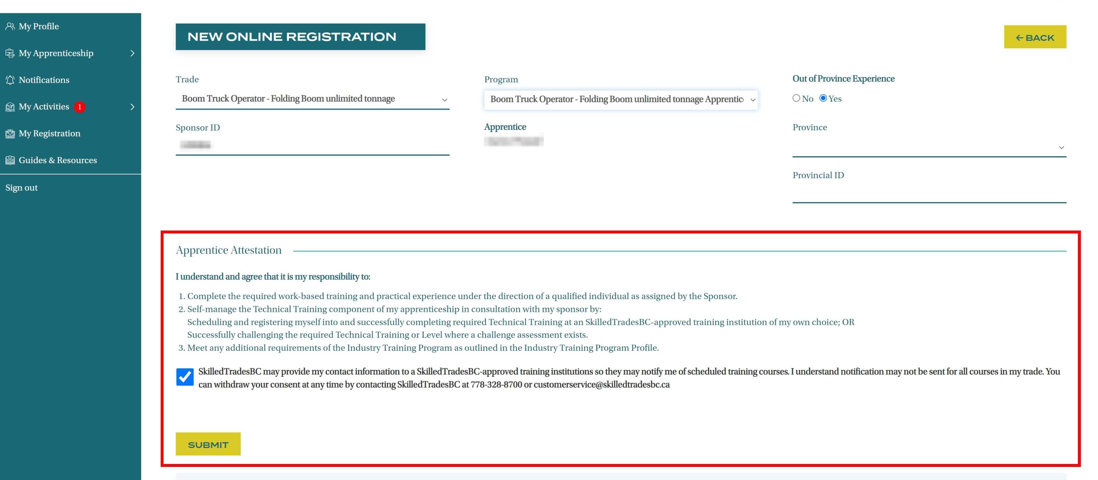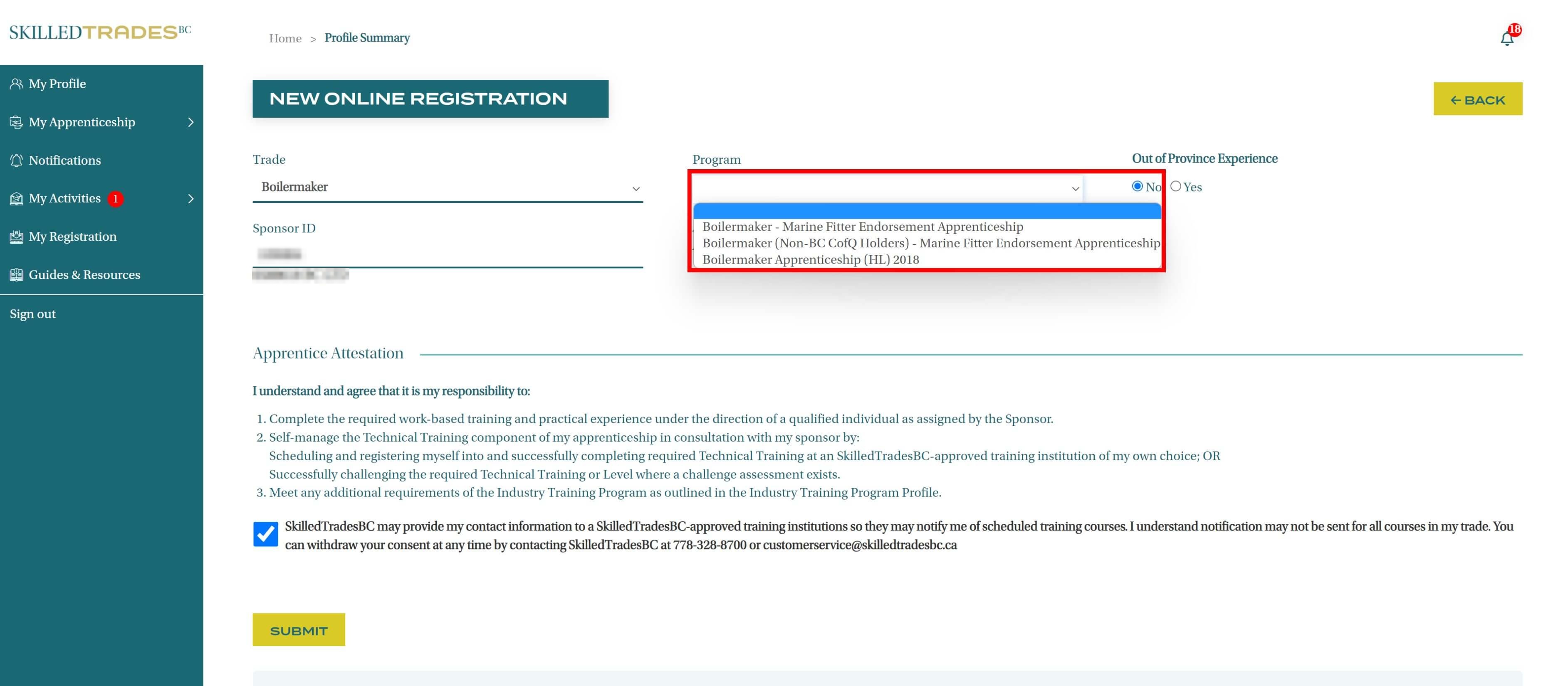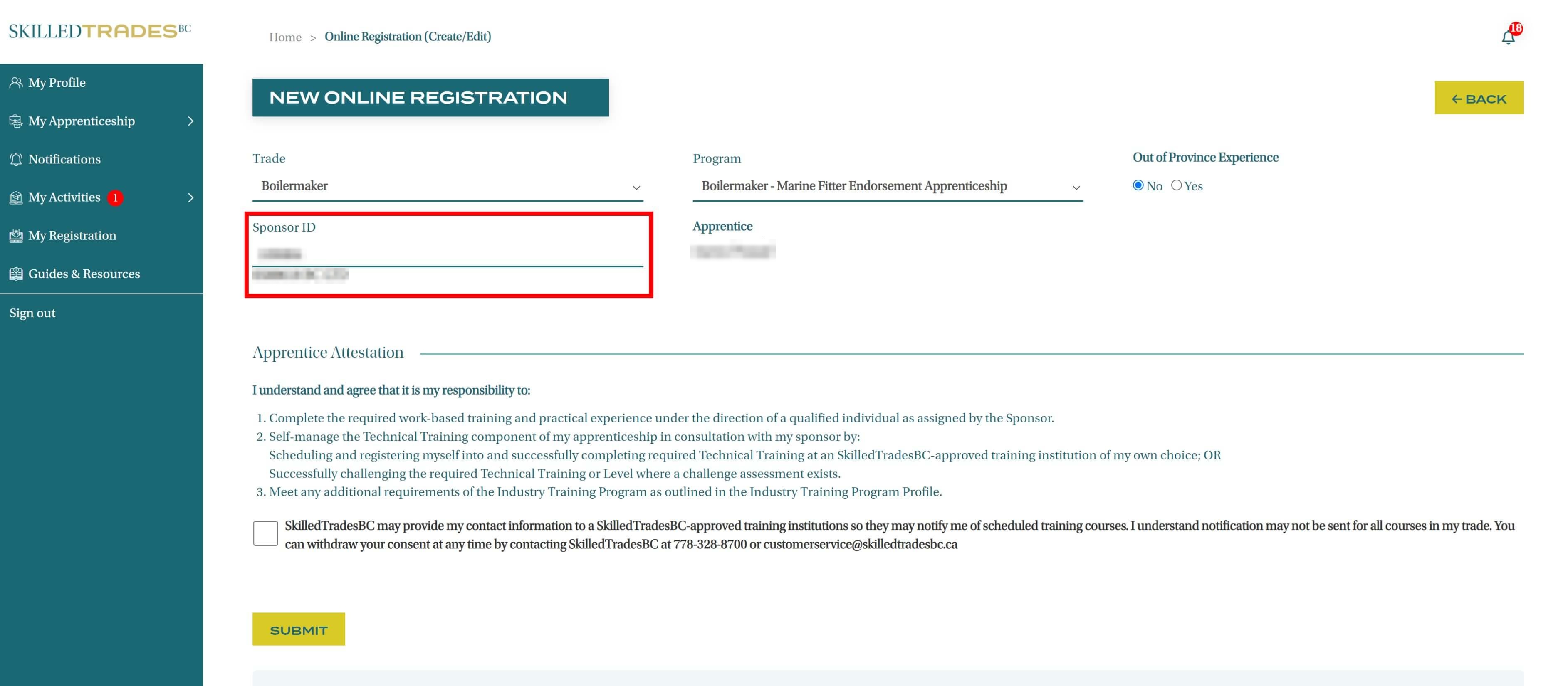 Sponsors may initiate the apprenticeship registration process on behalf of their apprentice through the Online Registration section in the Portal. They will need the apprentice’s SkilledTradesBC ID to start the process. Upon completing the registration, the respective apprentice will be notified to review and approve/deny the sponsor’s registration request.