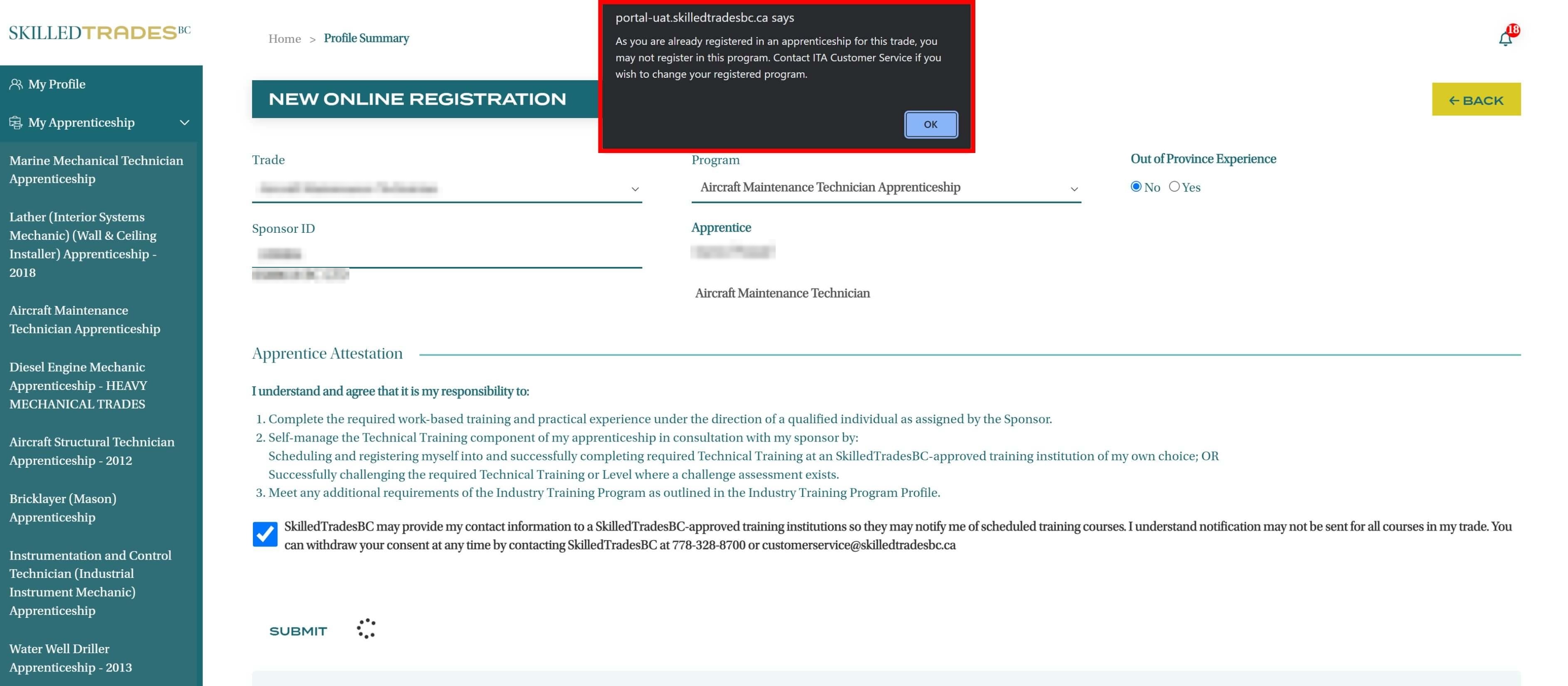 If an apprentice is already registered for the selected trade, an error message will appear and notify the apprentice that they may not proceed with the registration for the selected trade.