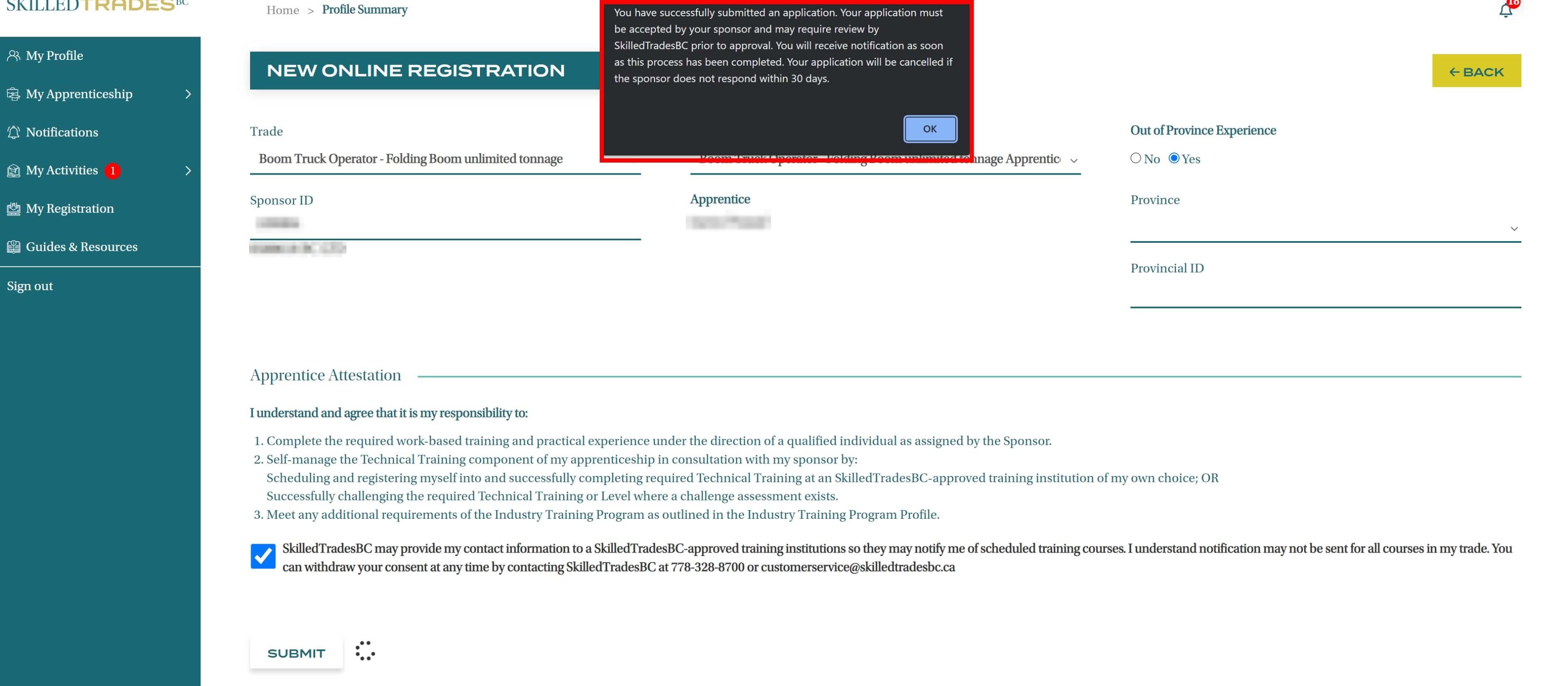 Once the SkilledTradesBC has reviewed the registration, the apprentice and the sponsor will be sent an email notification confirming that the registration has been processed.