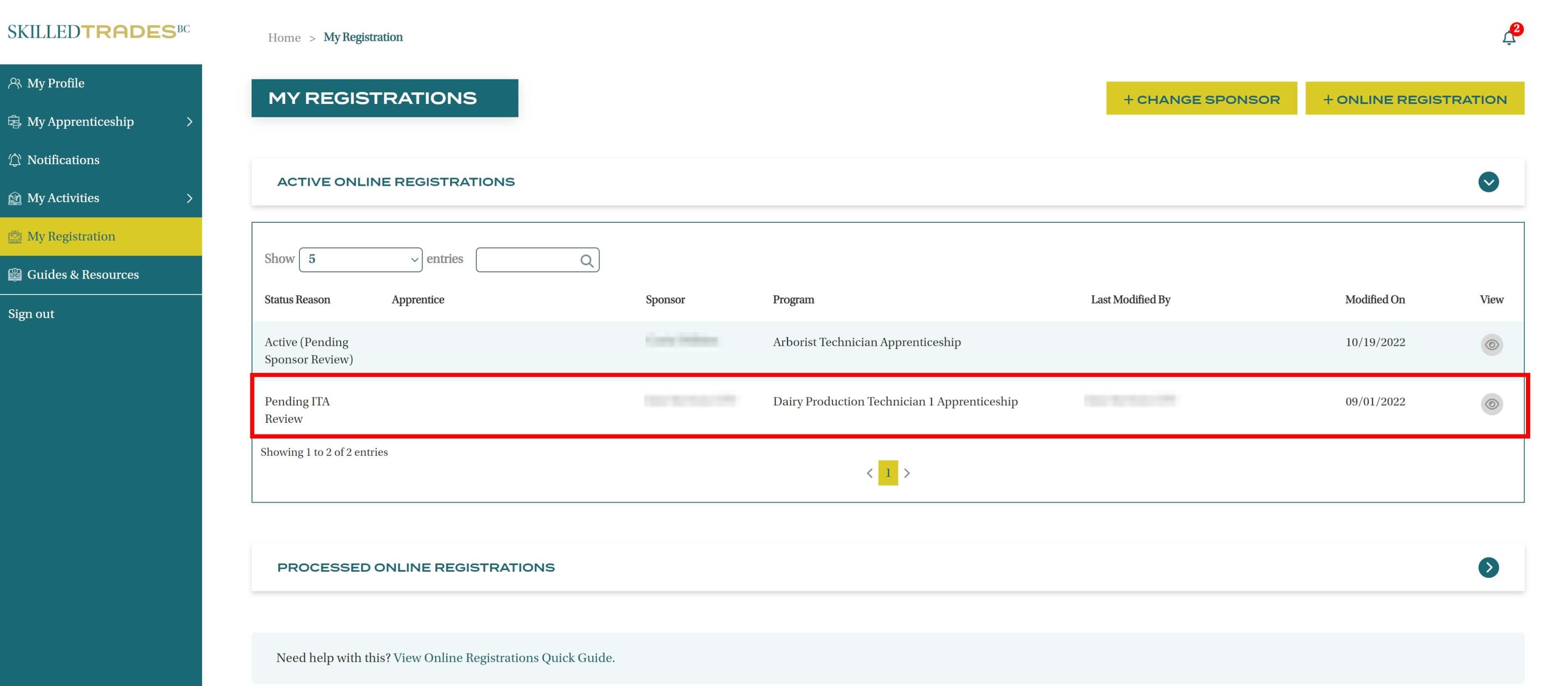 The registration request can be viewed under the Processed Online Registrations upon SkilledTradesBC review and approval.