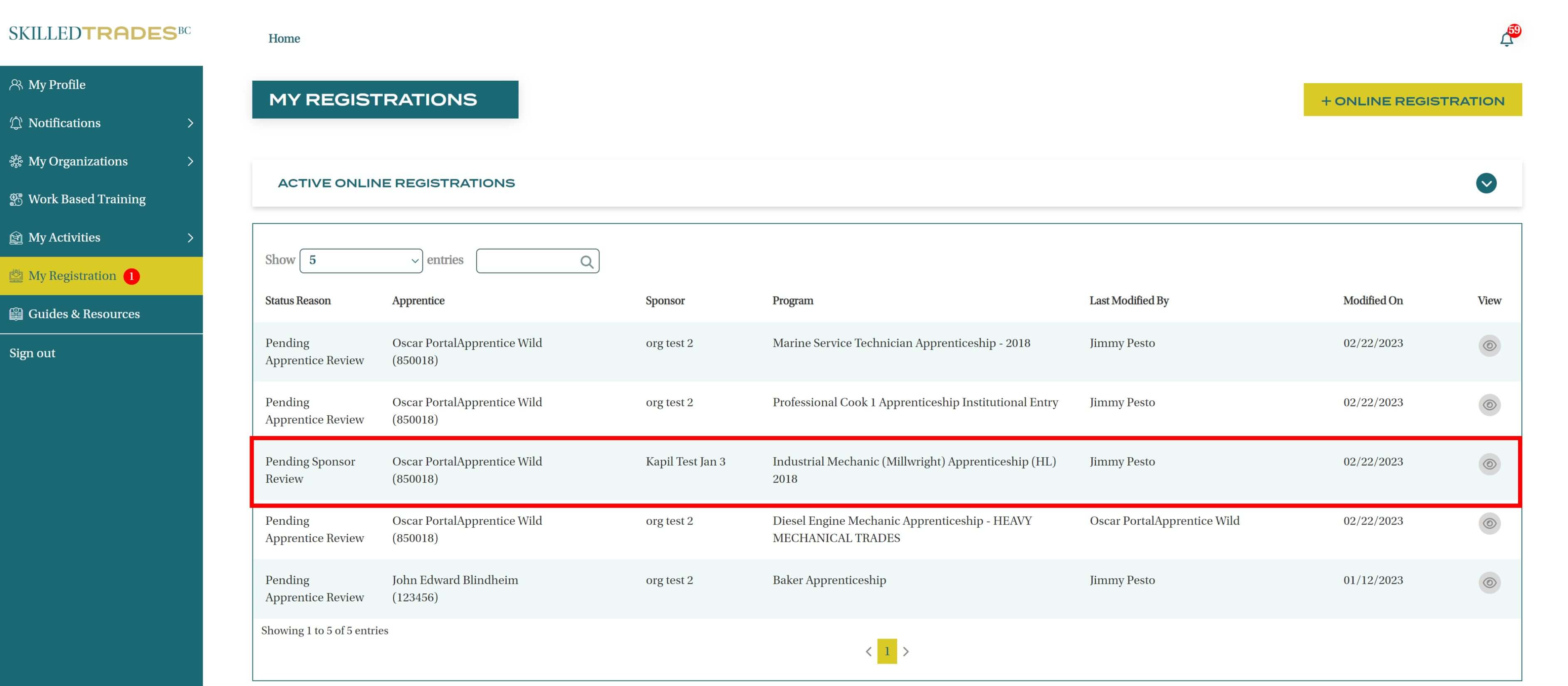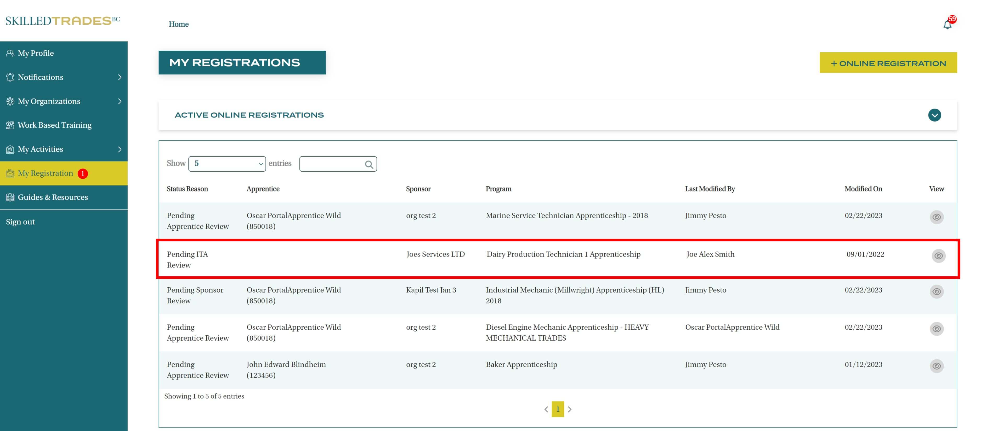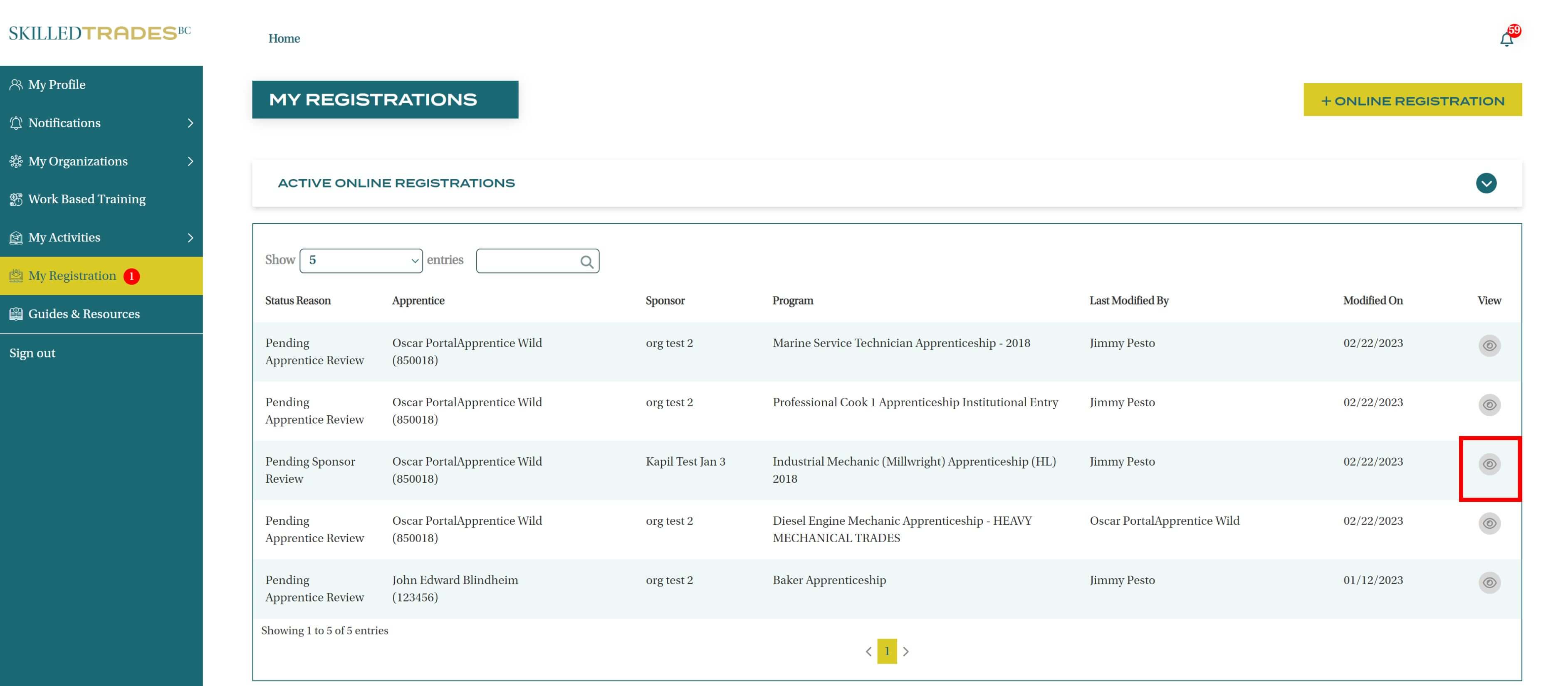 Apprentice’s registration request can be viewed under the Active Online registrations table.