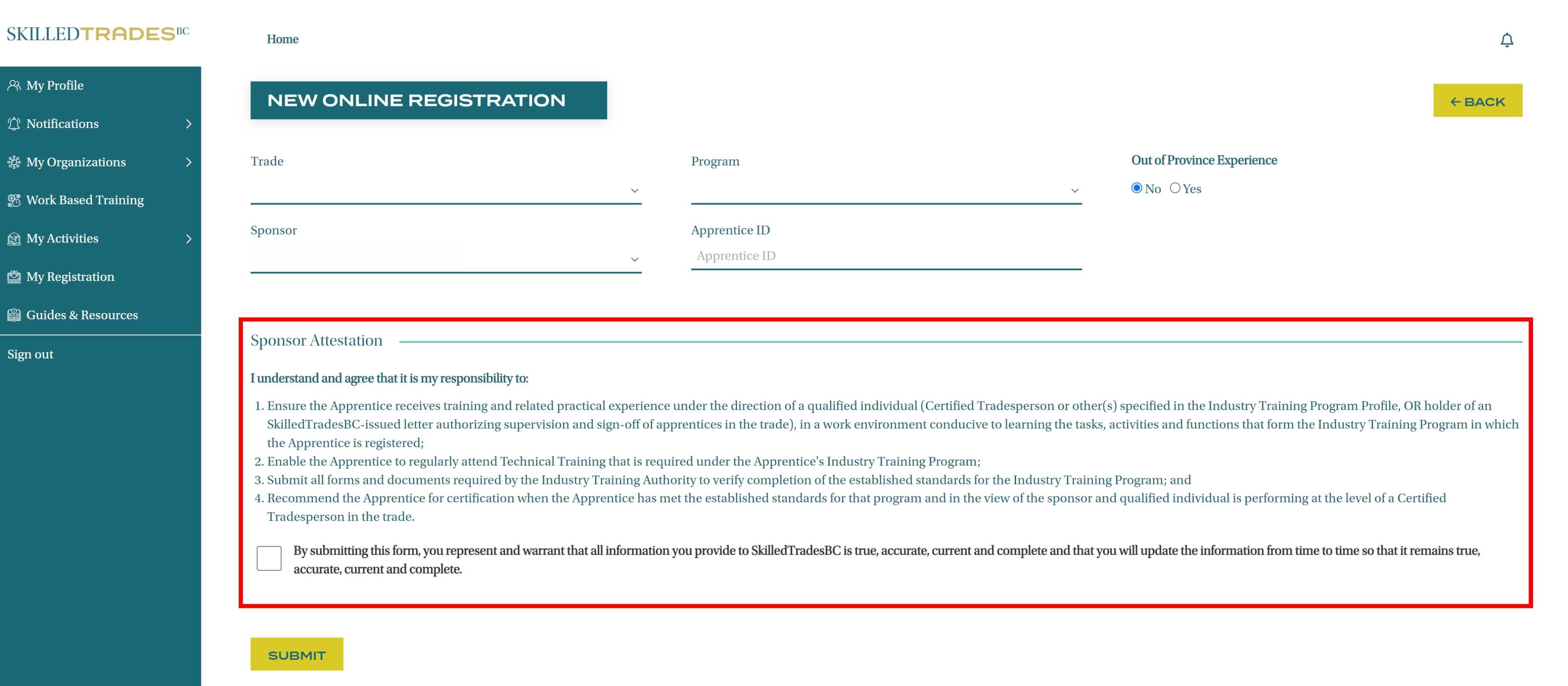 Sponsors can follow the steps below to review an apprentice’s apprenticeship registration request in the SkilledTradesBC portal. Sponsors have 30 days to review the registration.