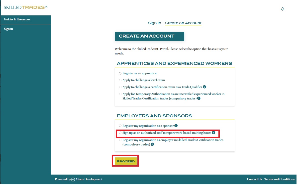 - On the Portal Create an Account page, select “Sign up as an authorized staff to report work-based training hours” and click on the “Proceed” button to start creating your account.