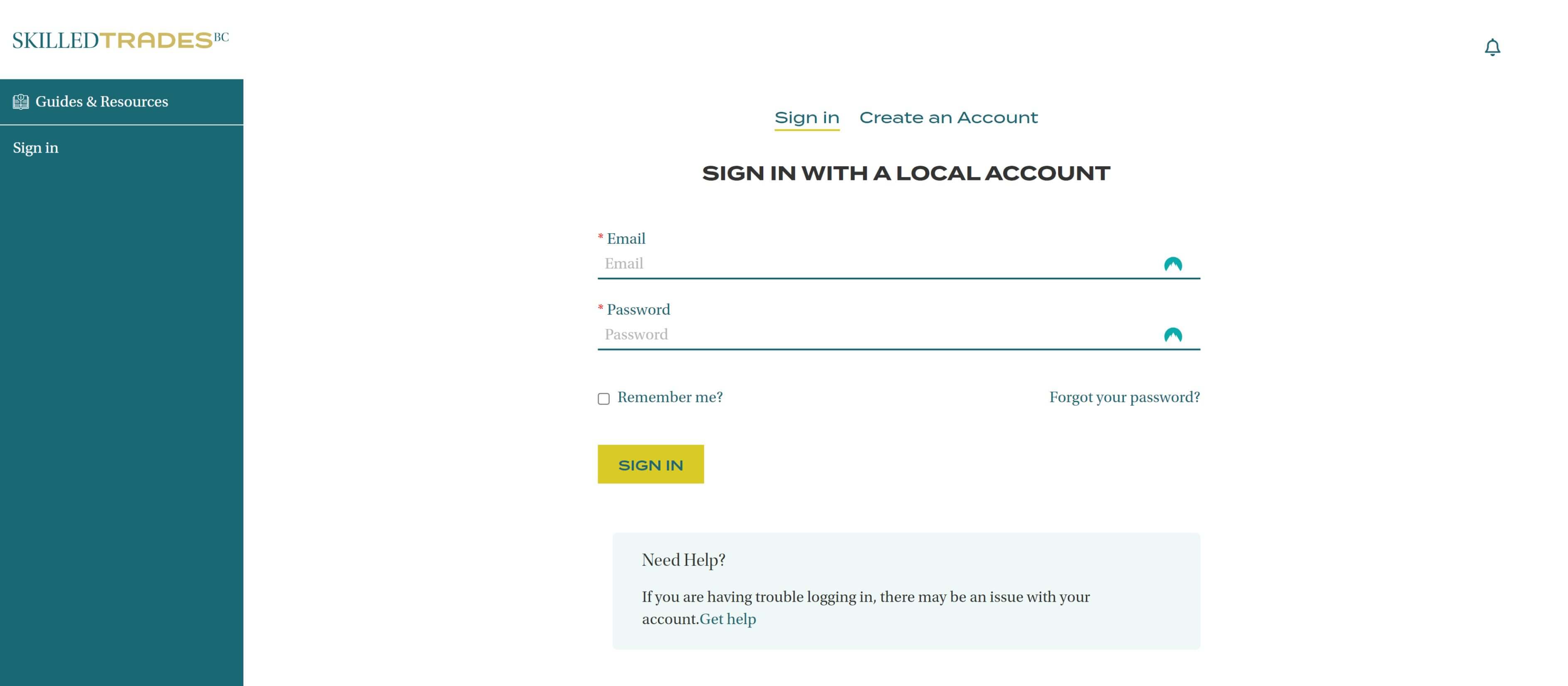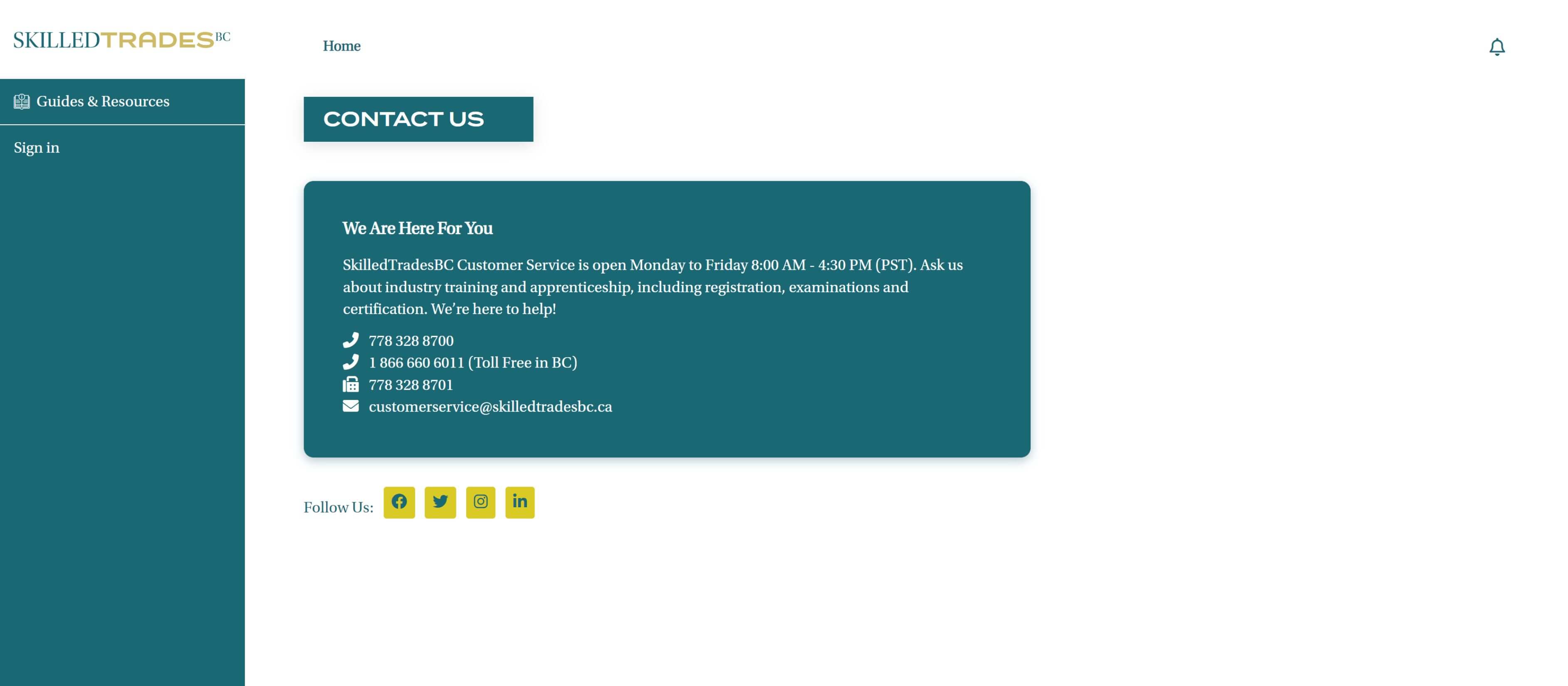 You DO NOT need to have an account with us to view our Customer Service contact information. On the SkilledTradesBC Portal Sign In page, click onto Contact Us at the bottom of the page. If you have an account with us, you can find the Contact Us button at the bottom of all pages.