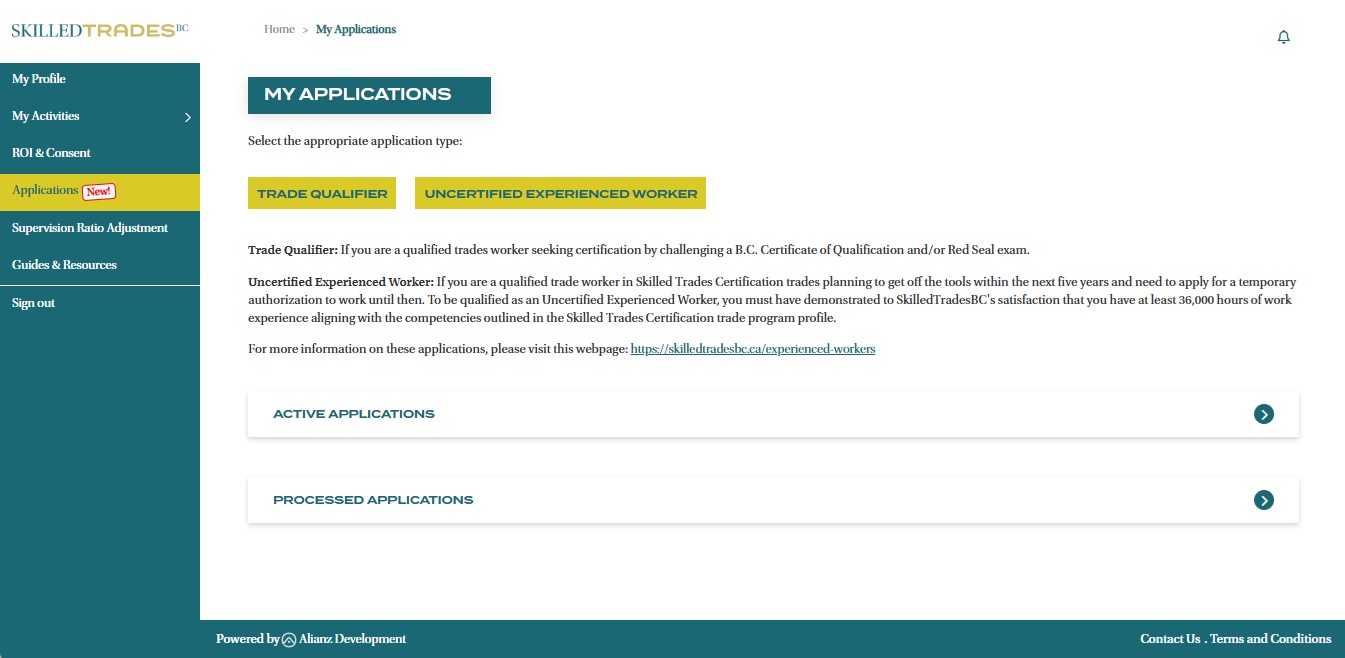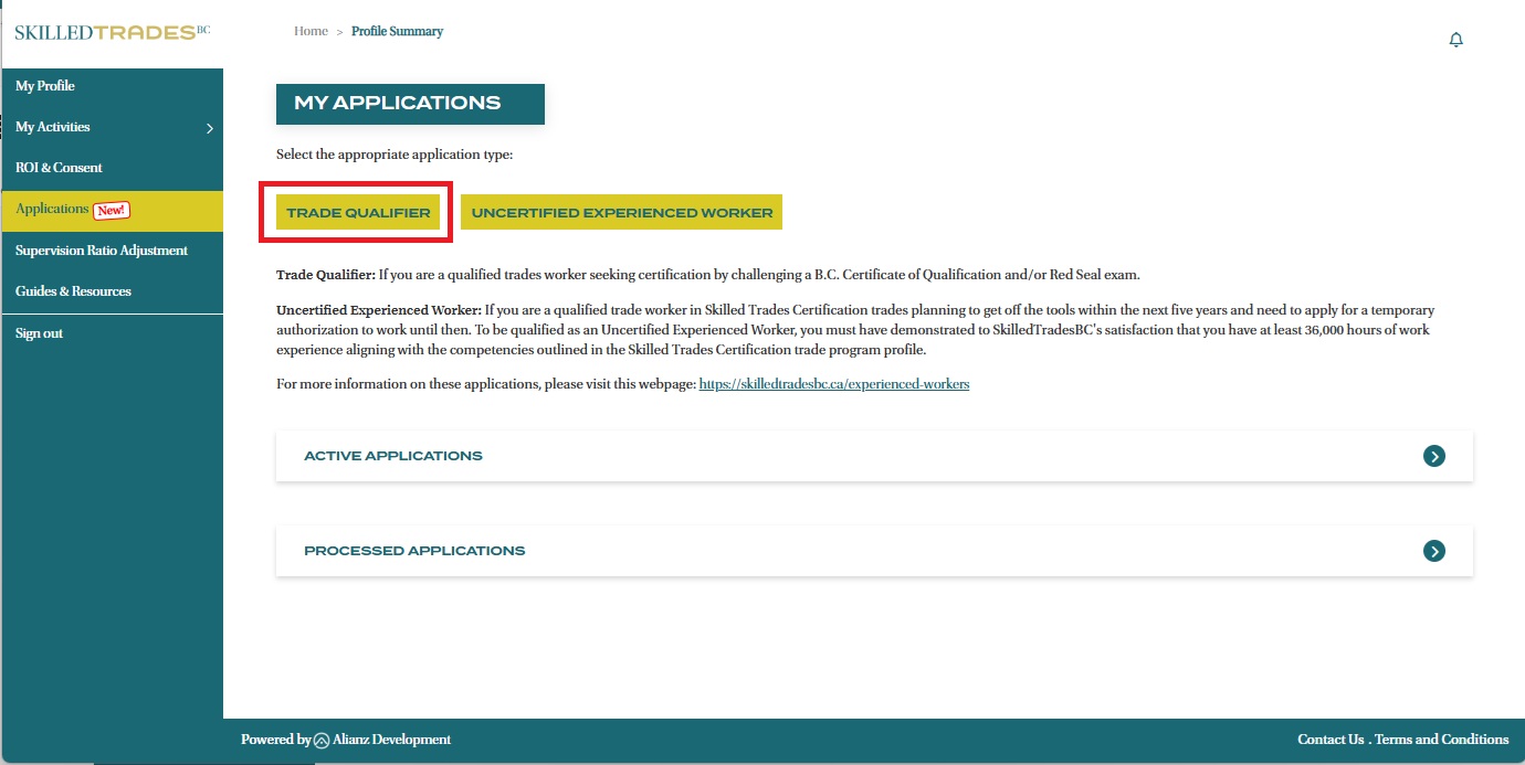- After logging in, click on “Applications” section from the left navigation menu. Click the “Trade Qualifier” button to start your application.