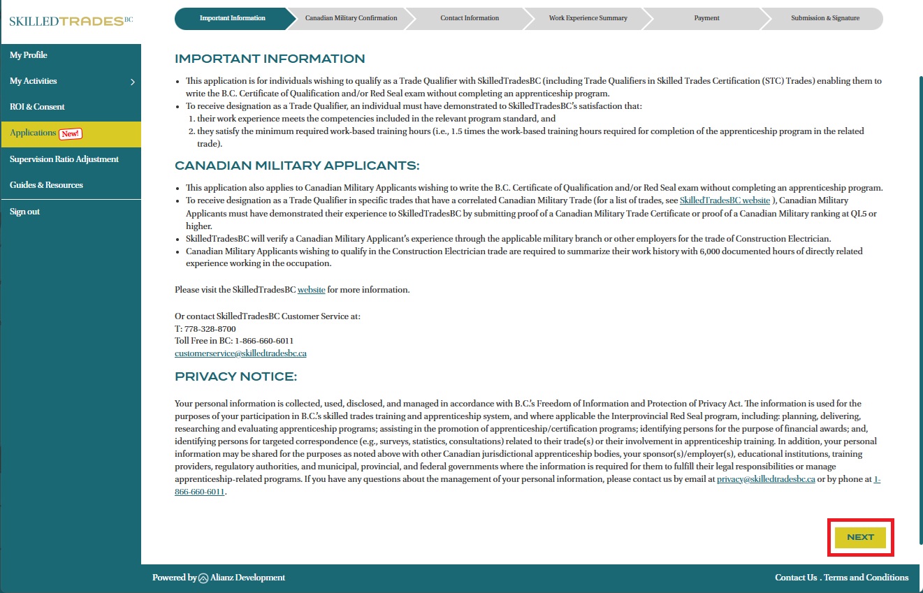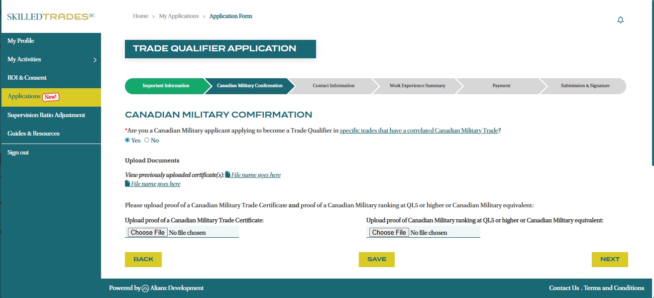 - On the Canadian Military confirmation page, select “Yes” if you are a Canadian Military applicant who want to challenge specific trades that have a correlated Canadian Military Trade.